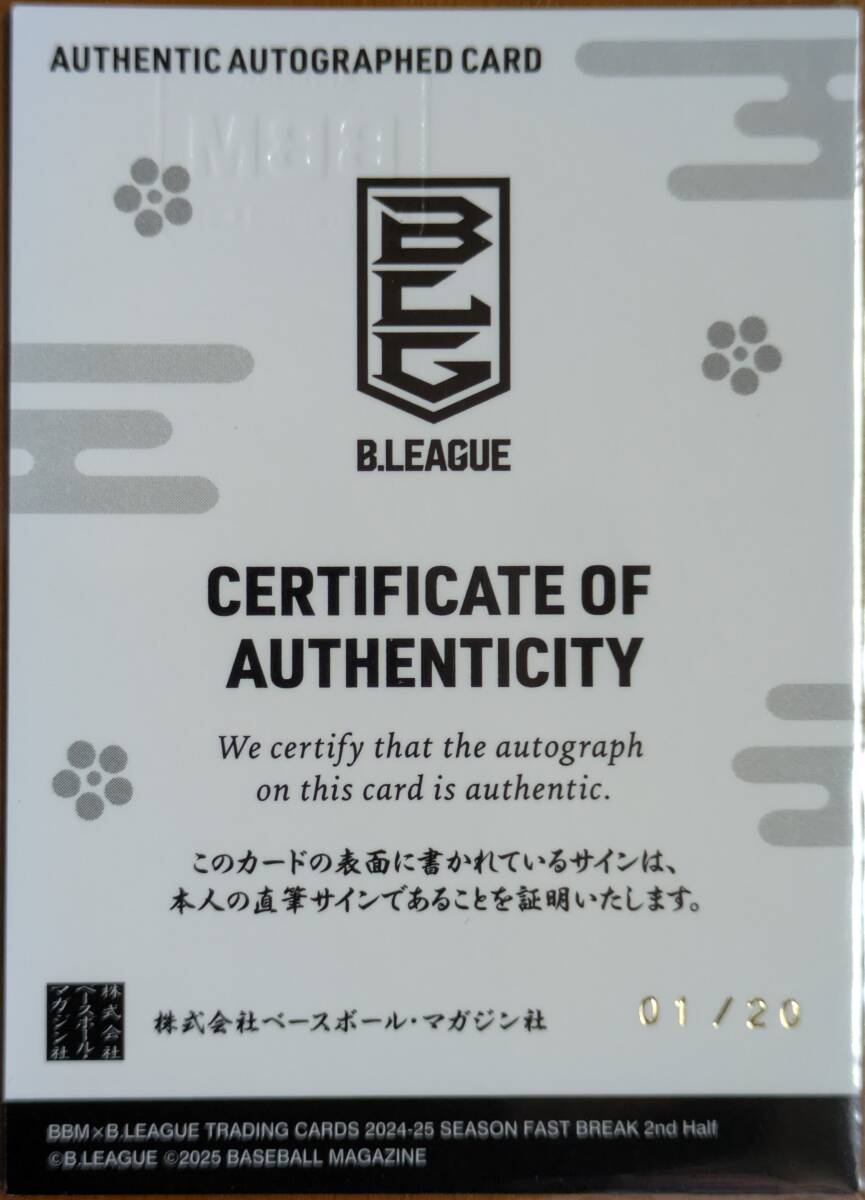 中村功平選手(茨城ロボッツ)の20枚限定縦版直筆サインカードです。