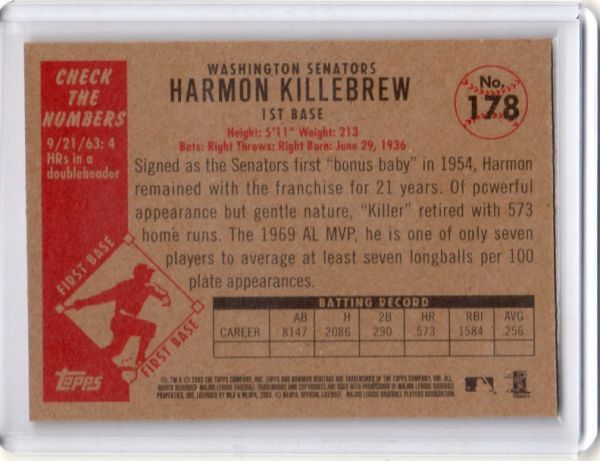 2003BOWMAN HERITAGE #178 ---------------------------------------------------- ■ハーモン・キルブリュー: メジャー22年(1954年デビュー/一塁手・三塁手・左翼手・DH) セネタース/ツインズ ロイヤルズ 2435試合 2086安打 573本塁打 1584打点 19盗塁 打率.256 MVP1回 オールスター11回 本塁打王6回 打点王3回 40本塁打以上 8回 100打点以上 8回 1965年ツインズ Wシリーズ出場 1984年殿堂入り 2011年没 キルブリュー・ファンの方、是非どうぞ! |
