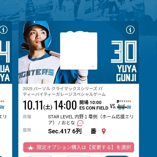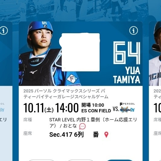 10/11(土) 10月11日 内野1塁側 ホーム応援エリア スターレベル クライマックスシリーズ エスコン 日本ハムファイターズ ペアチケット 2枚連番