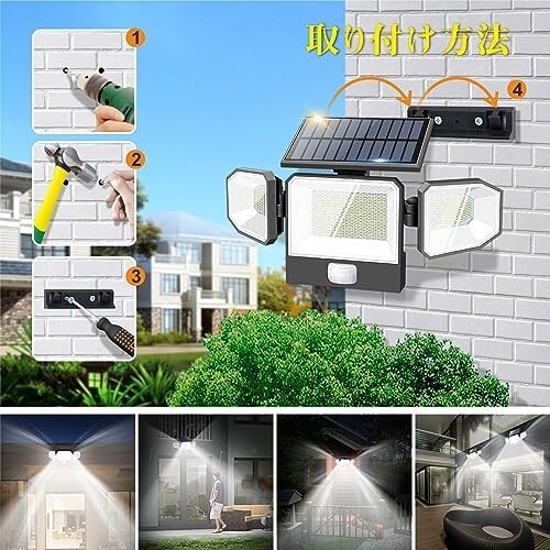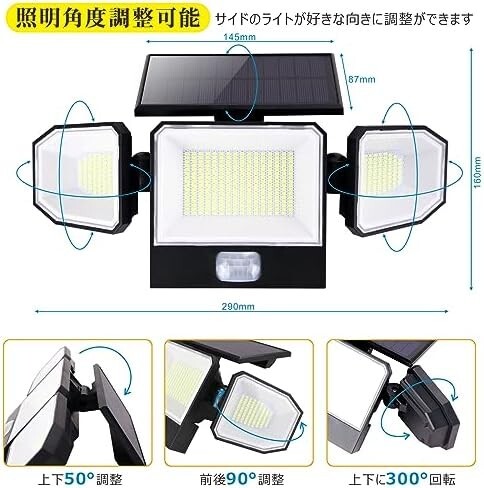 • 【新発売高輝度440LED&照明角度調整可能】従来のソーラーライトを基?として、ソーラーパネル、LEDチップ、バッテリー、光電変換率、明るさ、外観など全面的なアップグレードを行った。440個高輝度2835型LEDライト、高通過率ランプシェードを採用し、光源均一、昼光色6500K、光束3000ルーメン、照明性能ばっちり!ソーラーパネルと両側のライトを独立に回すことができるので、角度の調節がしやすい、ソーラーパネルを上下50°調整し、サイドのライトを前後90°調整し、上下に300°回転できます。サイドのライトが好きな向きに調整ができて照明角度が300°ほどに達し、照明の範囲も広く。
