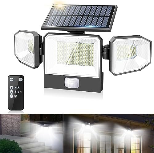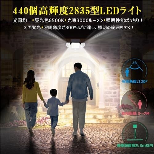 【アップグレード440LED】ソーラーライト 屋外 センサーライト 3つ知能モード 照明角度>300° 全方位調整可能 高輝度 光束3000ルーメン 人感センサー IP68防水 防犯 壁掛け ガーデン/庭先/表玄関/駐車場に適用 地震や台風の災害停電時 照明供与 リモコン付き 取り付け簡単