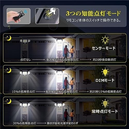 【リモコン付き&3つ点灯モード】センサーモード、DIMモード、常時点灯の3つ点灯モードが搭載させたセンサーライトです。製品のスイッチでモードを切り替えることができるだけでなく、リモコンで簡単に操作できます。?「センサーモード」夜や暗くなると、点灯しません。人や動物の動きが検知されると自動的に高輝度点灯になって、動きがなくなると約20秒後消灯になります。?「DIMモード」夜や暗くなると、自動的に10%の低輝度で点灯します。人や動物の動きを感知した次第、自動的に100%の高輝度で点灯になって、動きがなくなると約20秒低輝度の点灯状態に戻ります。?「常時点灯モード」昼間や明るい環境に、点灯しません。夜や暗くなるんと、自動的に30%の低輝度で連続点灯しています。