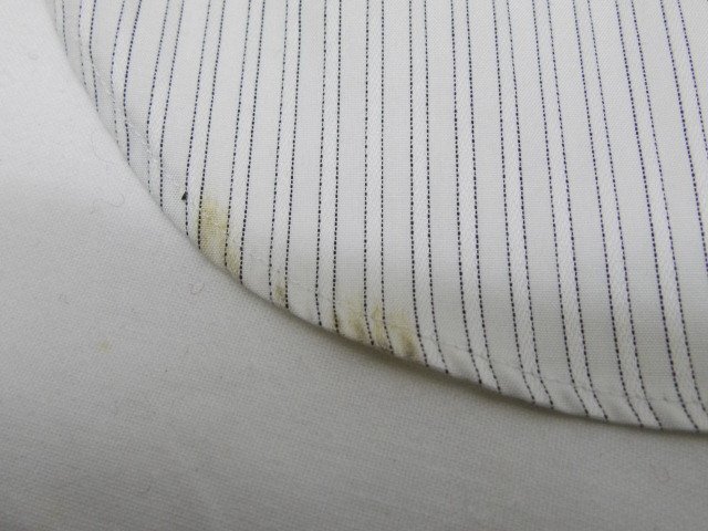 〇状態は少々使用感、若干シワ、右袖口、後ろ裾、ブランドタグ上部分にシミヨゴレがあります。
