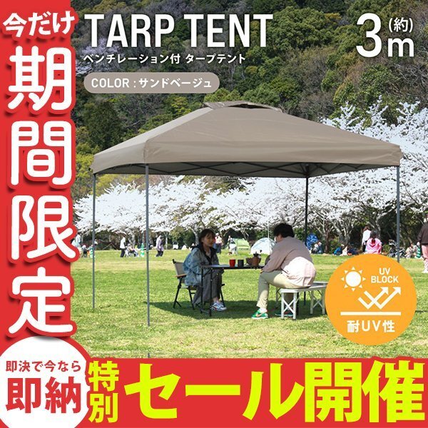 強い日差しでもこの3m×3mのタープテントは快適な日陰を作ってくれます! |