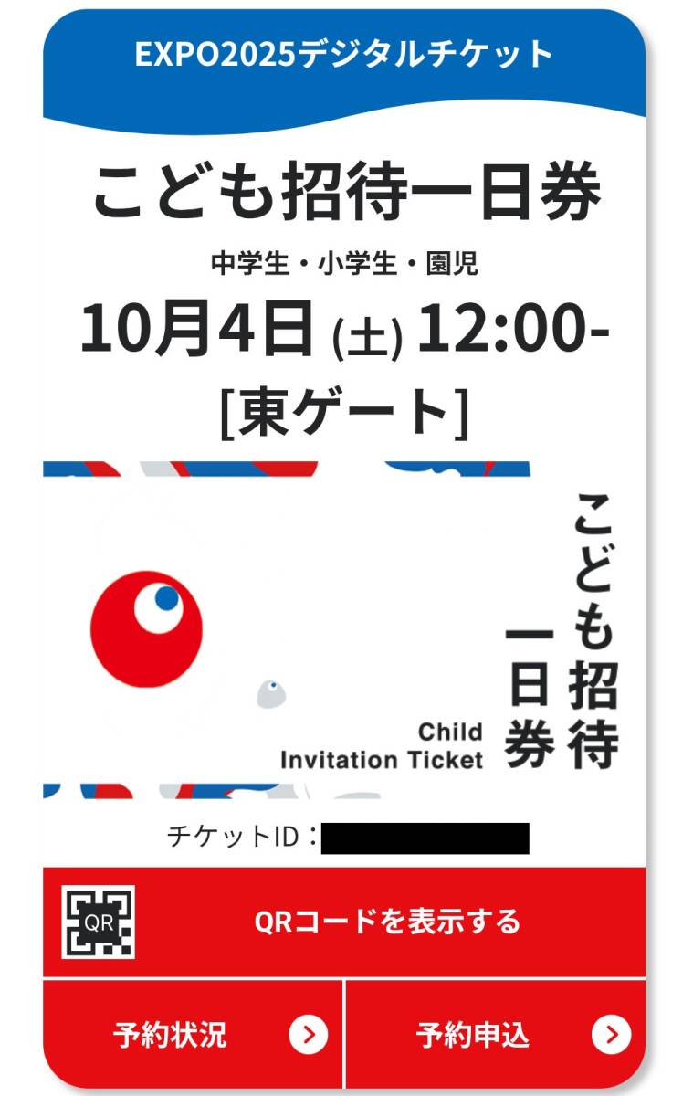10/4(土曜日) こども招待一日券 12時東ゲート予約済 EXPO2025 入場チケット 大阪万博 入場券 関西万博