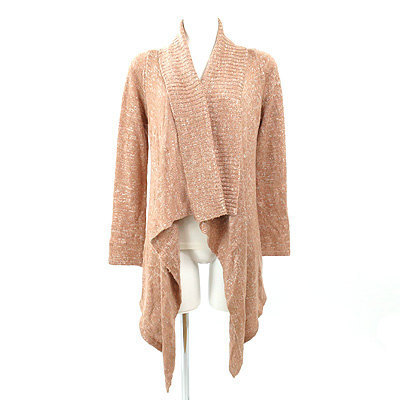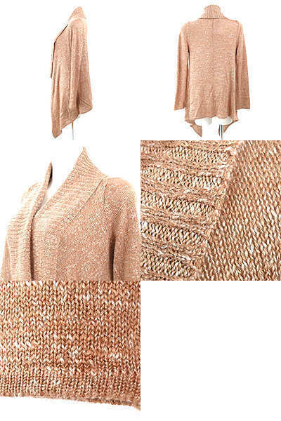 リブ編みの衿デザインがリュクスな雰囲気漂う1枚♪ さりげなくラメ糸が使われていて、華やかさもほんのりプラス☆ フロントの裾が作り出すドレープが縦ラインを意識させ すっきりとしたスタイルに見せてくれるのも嬉しいポイントです。 ボタンレスでさっと羽織れば大人のキレイめカジュアルスタイルの完成! お袖部分や擦れる箇所に毛羽立ちが見られます。 肩幅約33cm バスト約86cm 着丈約63cm 袖丈約60cm 【サイズ】:(38)B82 H88 T164 【素 材】:(アクリル87%レーヨン9%ナイロン4%) 【 色 】:(ピンクオレンジ系) 【程 度】:(AB) 管理番号 54141105-001 427 023 | ||||