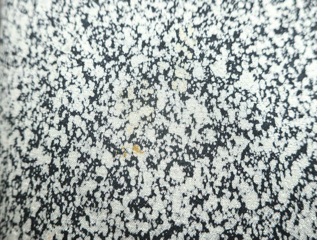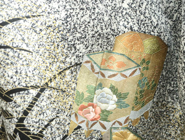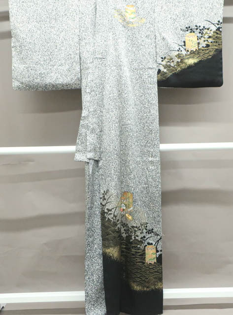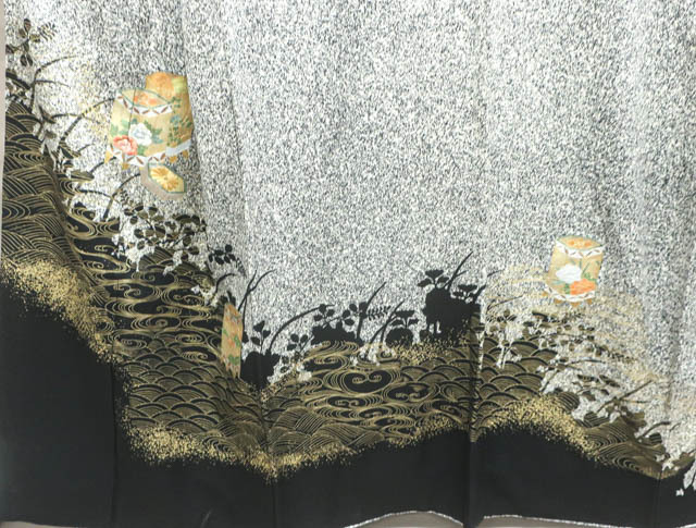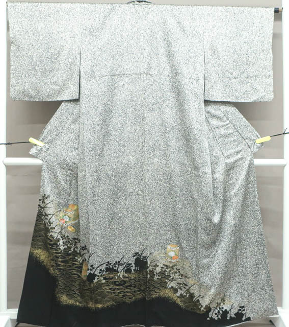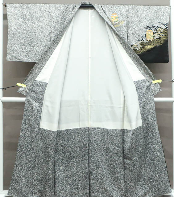 リサイクル商品のため、右前袖に汚れがございますが着用可能なお品です。 地色は、黒色です。 1枚目の画像が近いお色かと思われます。 素材は正絹です。 |