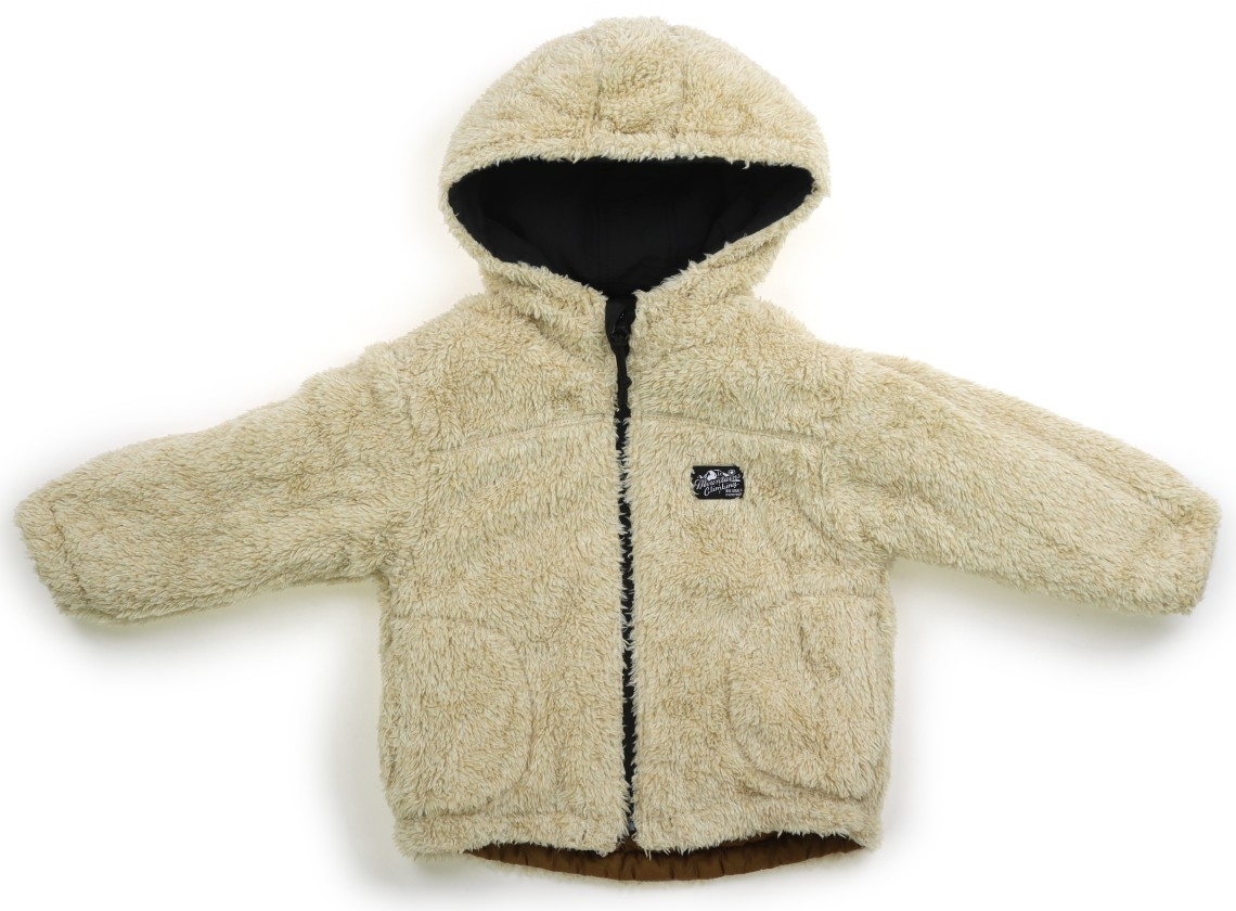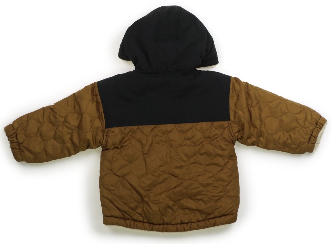 キルト生地とボア生地のリバーシブルで着られます。中綿の暖かいアイテムです。フードは縫い付けです。黒い部分にやや色褪せ、袖口ボア生地に若干つぶれがありますがまだ活躍してくれそうです。