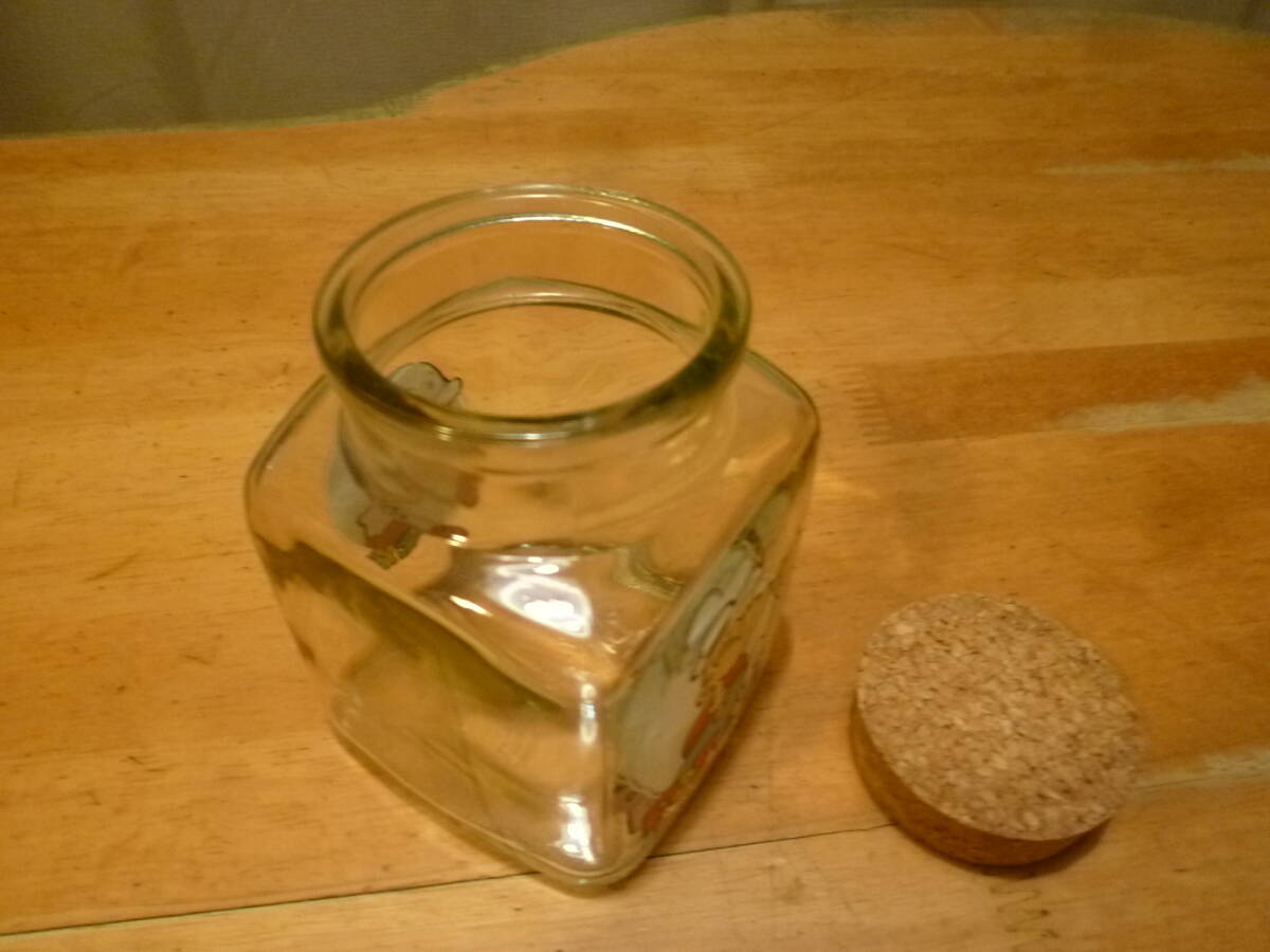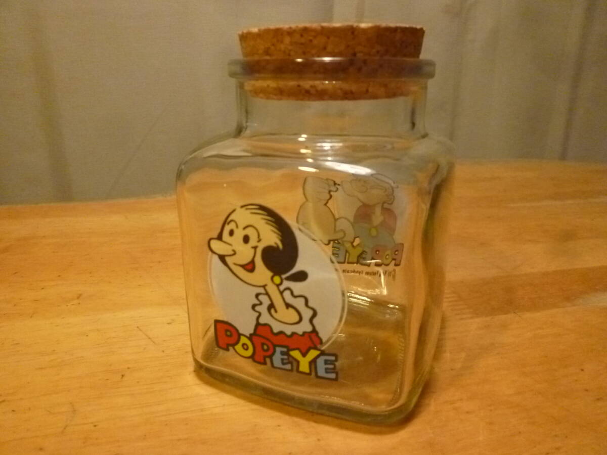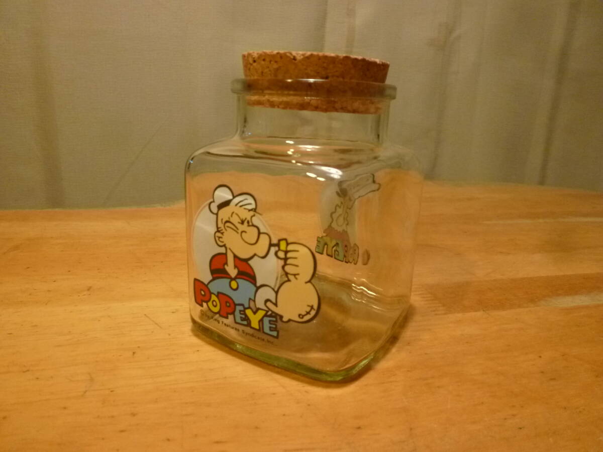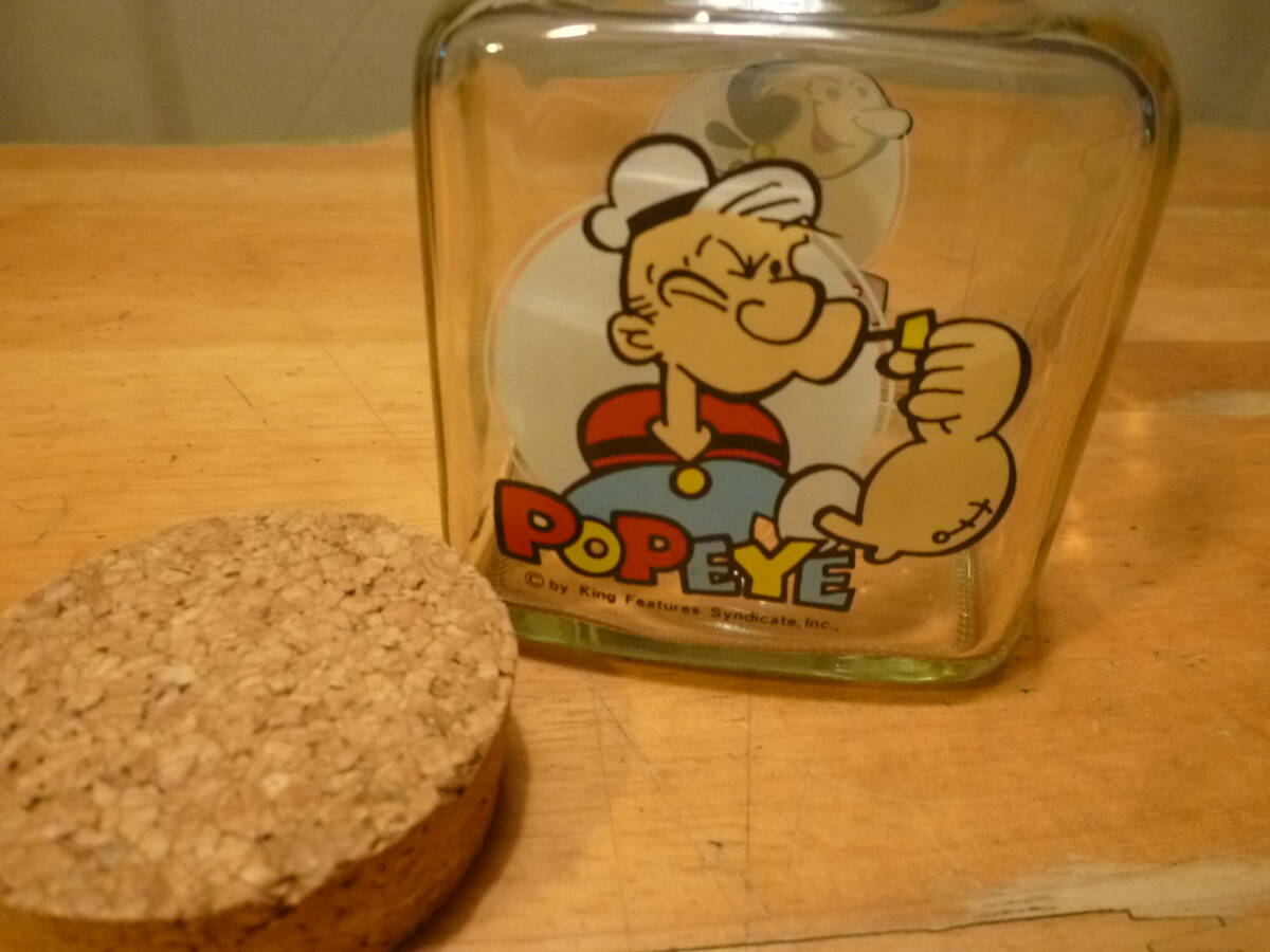 こちらは分厚い感じのポパイとオリーブのプリント入り角瓶の様で、コルク栓付です。