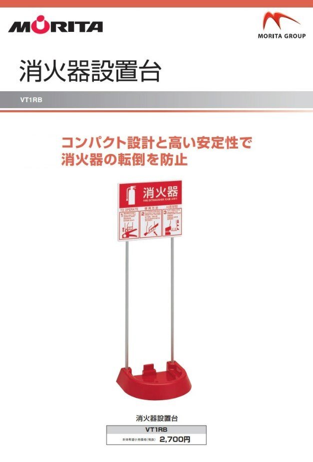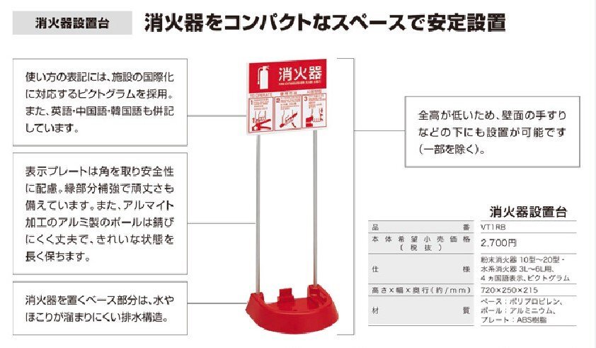 【参考基準価格】1台¥2,700- (税別) 【メーカー】モリタ宮田工業 【サイズ】幅250×奥行×215×高さ720mm 【素 材】ベース:ポリプ口ピレン ポール:アルミニウム プレート:ABS樹脂 【重 量】約370g 【仕 様】粉末消火器10型~20型用・水系消火器3L~6L用・ 4ヵ国語表示・ピクトグラム 【状 態】新品 =特徴= ・コンパクト設計と高い安定性で消火器の転倒を防止。 ・業界初の4か国語対応+ピクトグラム・ユニバーサルカラー。 =特記事項= ※こちらの商品は2台セットの商品となります。 ※消火器は商品に含まれておりません。 ※2020年12月に購入後、未使用のまま倉庫に眠っていました。 |
