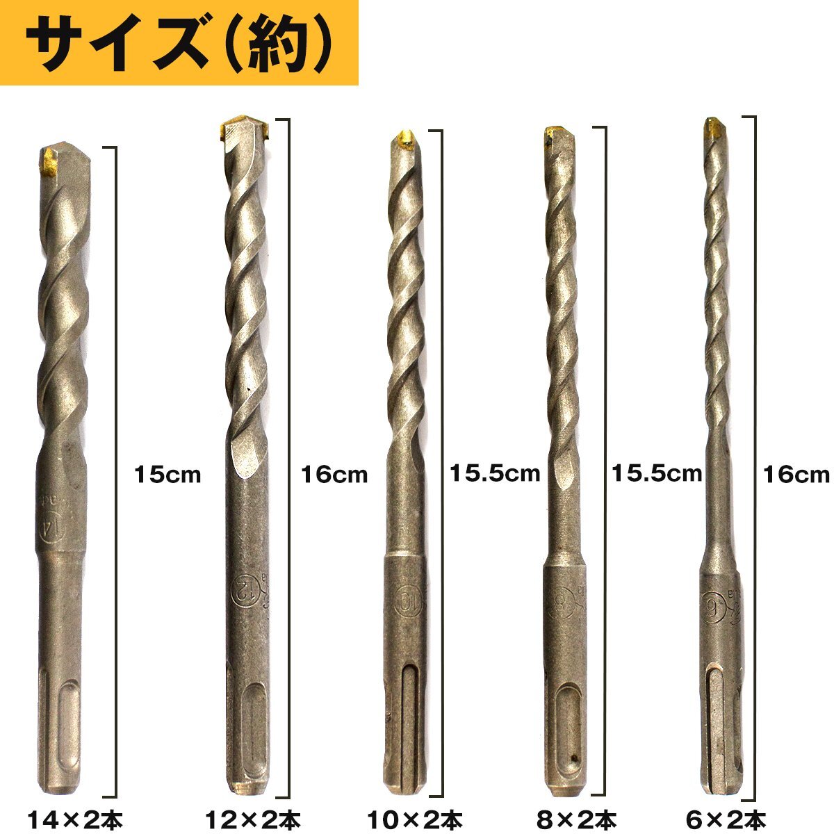 10本 セット コンクリート ドリル 刃 刃径 6mm 8mm 10mm 12mm 14mm 各2本 SDS 振動 ドリルビット ボッシュ同等 ハンマー DIY