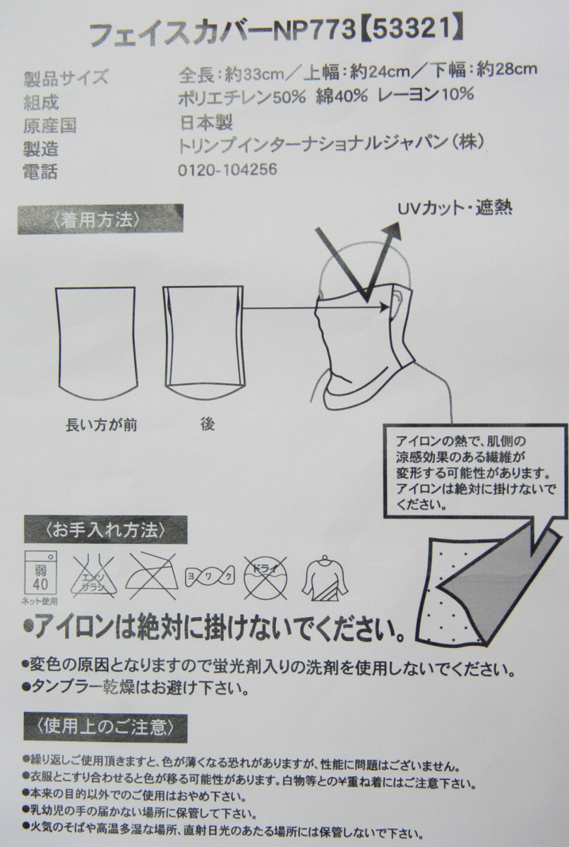 ・アイロンの熱で、肌側の涼感効果のある繊維が変形する可能性がありますので、アイロンの使用はお控えください。