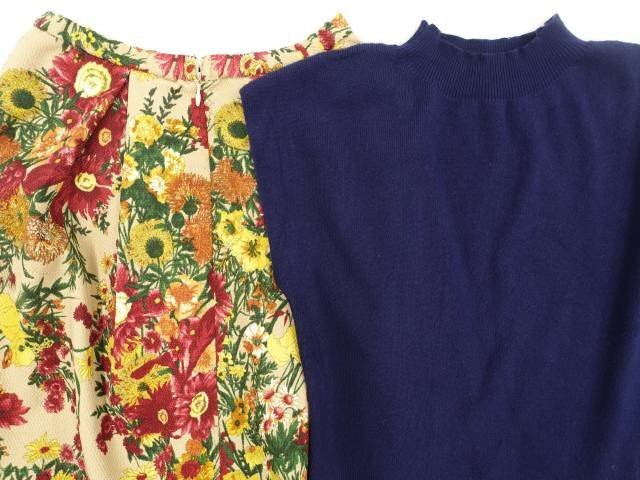 半袖ニットカットソー+ミニ丈タックセミタイトスカート+ひざ丈ボックスプリーツスカート コーディネート上下3点セット S相当 ネイビー/ブラック×ホワイト 格子柄/ベージュ地 レッド×イエロー×オレンジ 花柄 ガーリー系 20代・30代