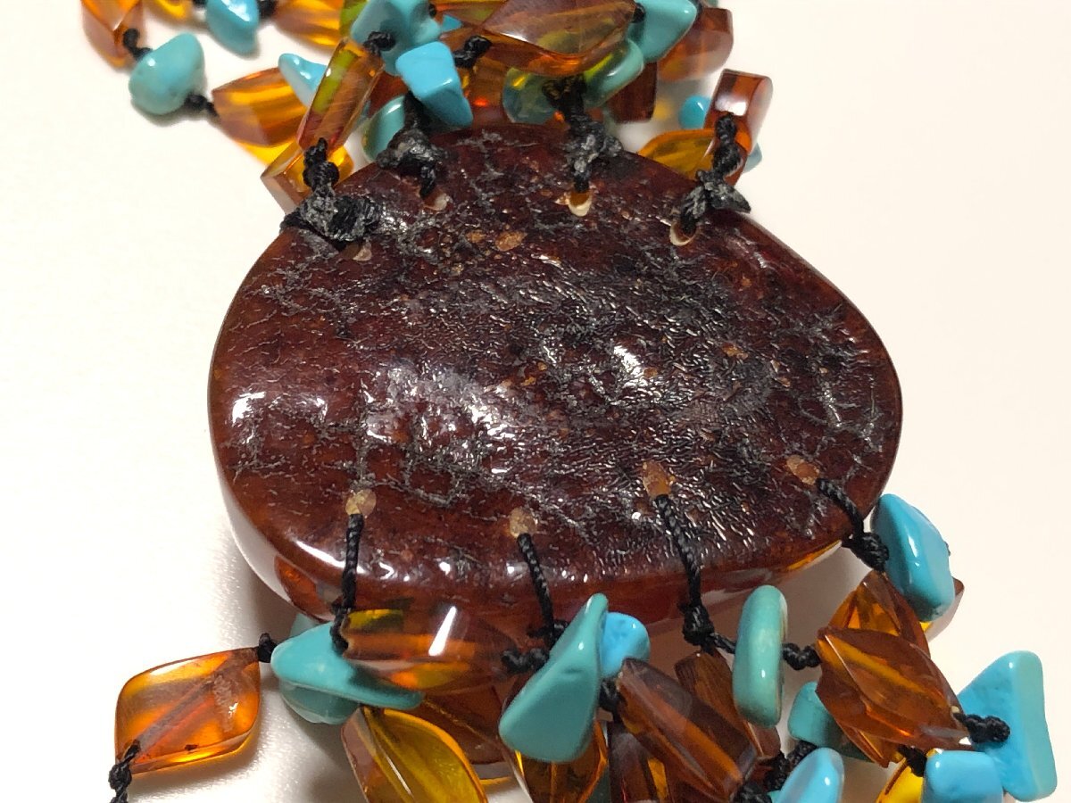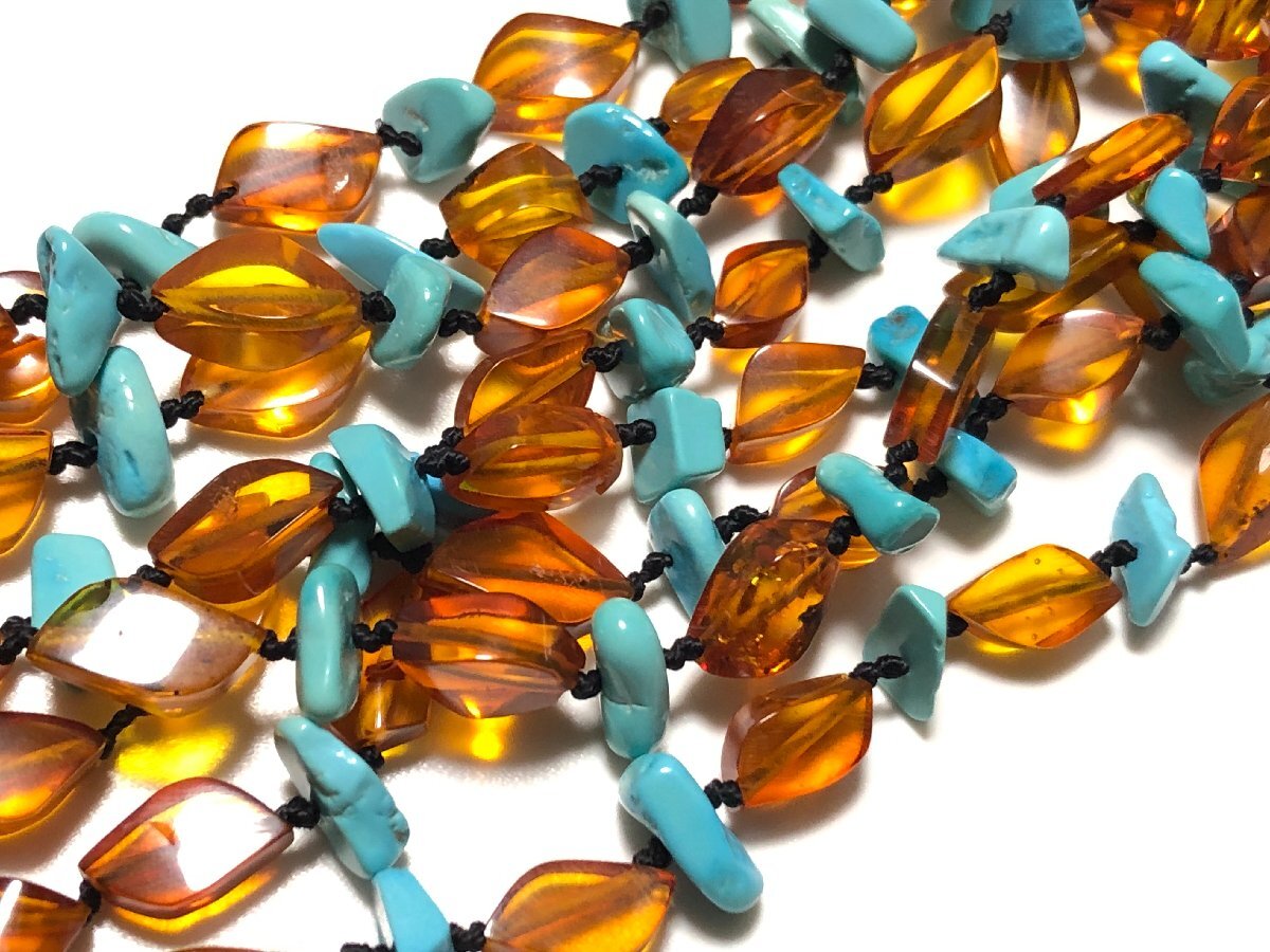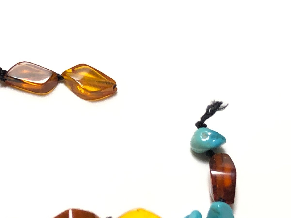 イタリア、evaNUeva(エヴァヌエヴァ)の本琥珀、ターコイズを使用した、8連デザインネックレスです。1ヵ所切れている部分があります。