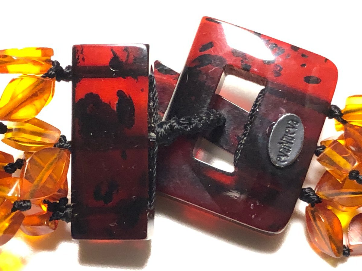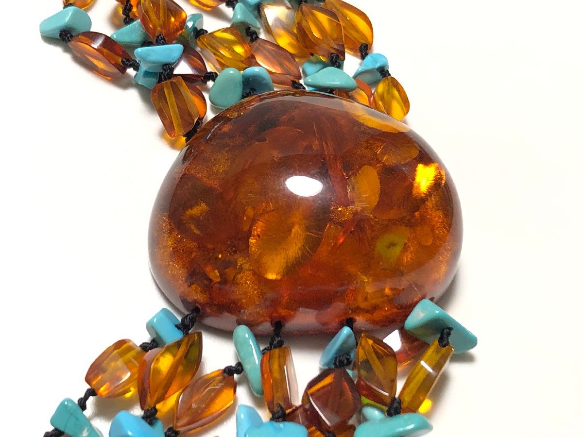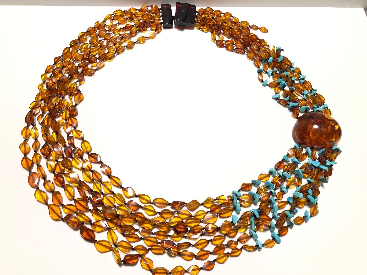 イタリア、evaNUeva(エヴァヌエヴァ)の本琥珀、ターコイズを使用した、8連デザインネックレスです。1ヵ所切れている部分があります。