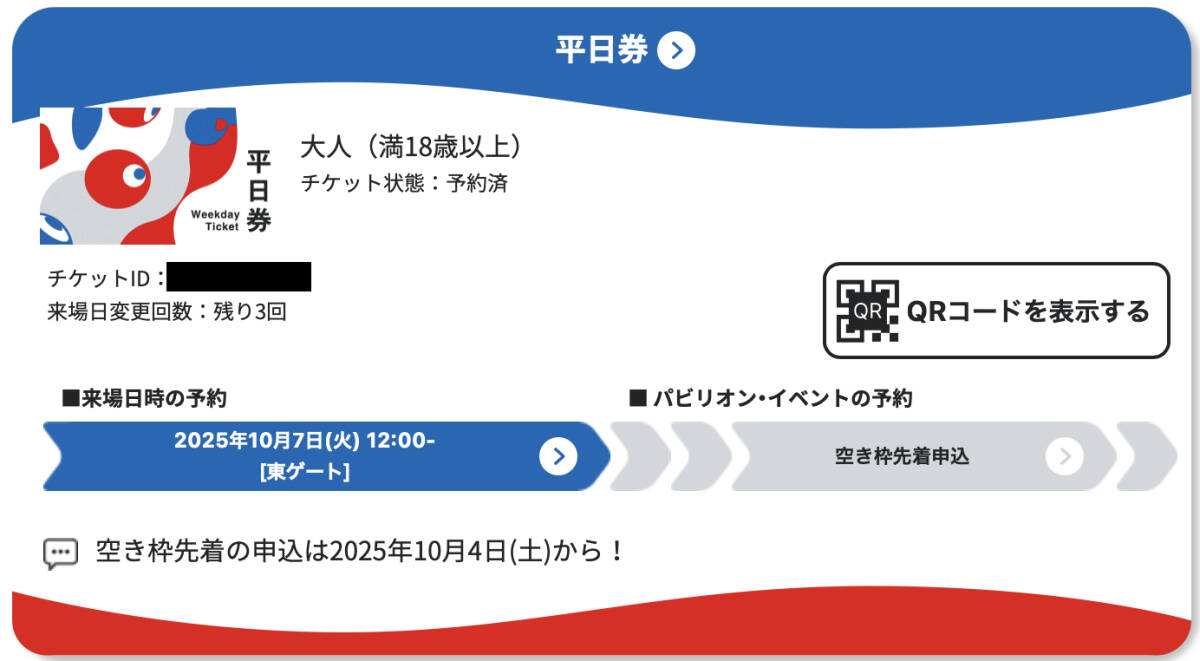 2025年 万博チケット 10/7 東ゲート 12時入場 平日券 大人1枚 3回変更可 EXPO2025 入場券