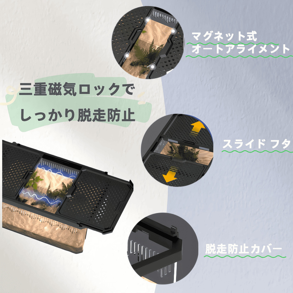 蓋全て磁石式閉じて、可愛いペットたち脱走かなり難しい、左右スライド式トップカバーを開閉するため、餌あげるのは凄く便利なのです。