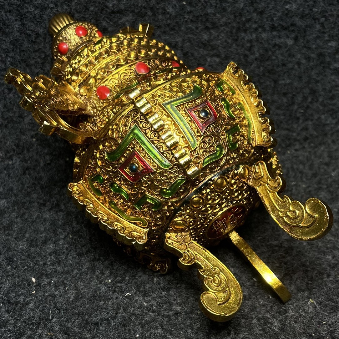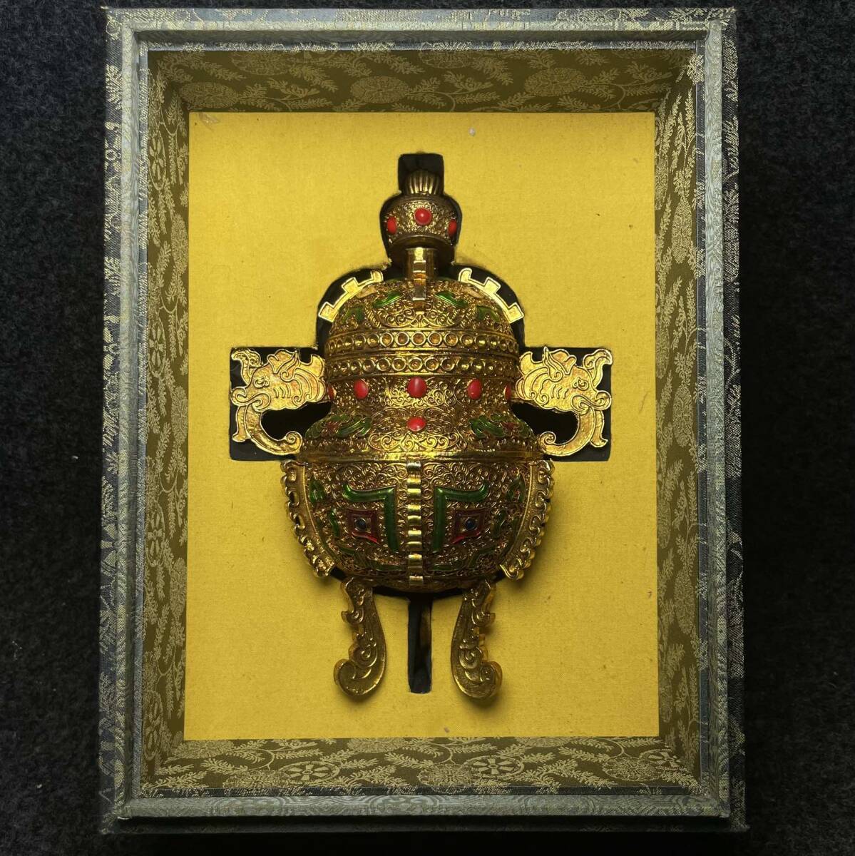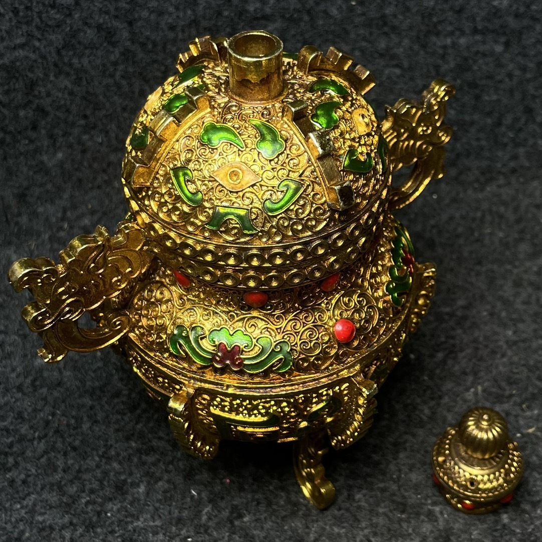 【超珍館蔵】 銅製細作 塗金 寶石嵌 雙龍耳三獣足 熏香爐 擺件 箱付 置物 賞物 古賞物 古董品 古美術品 時代物 旧家蔵出 稀少珍蔵品