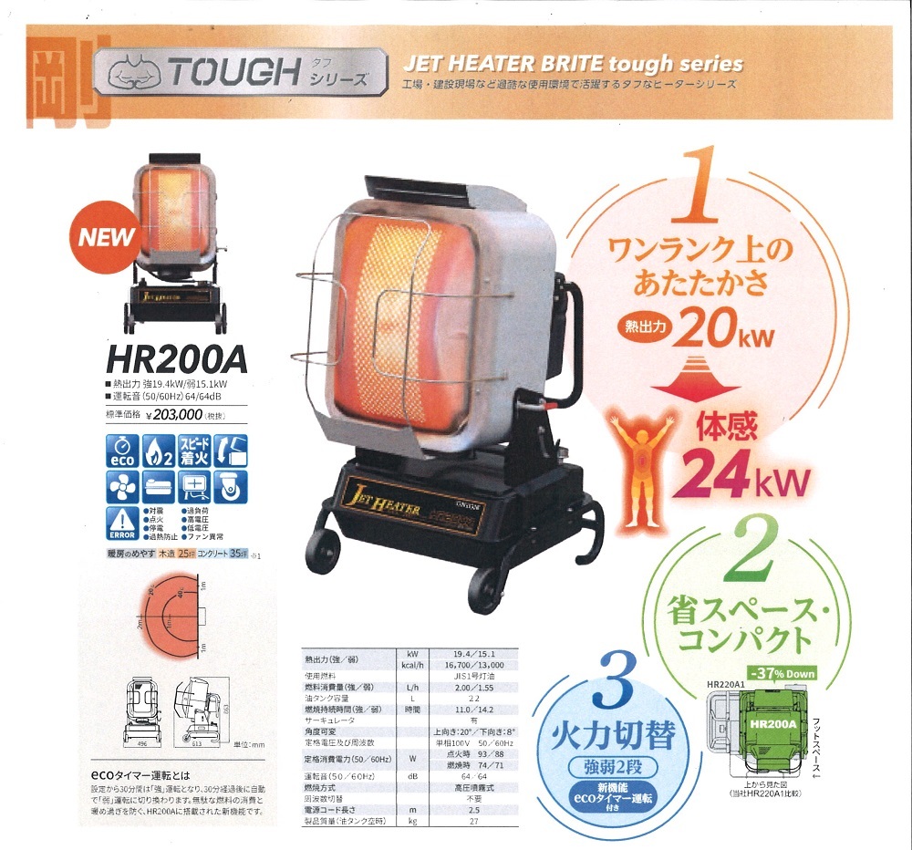 【商品詳細】 【ORION HR200A ジェットヒーター 50Hz】~こちらの商品は〈業務用〉となります。~ 型式:HR200A 熱出 : 19.4 kW/16,700 kcal/h 使用燃料 :灯油(JIS1号灯油) 燃料消費量 :2 L/h 油タンク容量 :22L 燃焼持続時間 :11.0時間 サーキュレーター付き 角度可変 :上向き:20度/下向き:8度 定格電圧及び周波数 : 単相100V 50Hz 定格消費電力 :点火時93W 燃焼時74W 運転音 :64db 燃焼方式 :高圧噴霧式 寸法(高さ×幅×奥行) :863mm×496mm×613mm 周波数切替 : 不要 電源コード長さ :2.5m 製品質量(油タンク空時):27kg 適用面積: 温暖地 木造25坪 / コンクリート35坪 ■シーズン商品になりますので、在庫が無くなる場合がございます。 ※廃番・後継等がございます。その際は、お知らせさせて頂きます。 ※北海道、沖縄、離島等、別途送料が発生する場合がございます。 ※混載便、車上渡し、日時不指定にて送料無料となります。 ■不明な点、ご心配事は事前にお問い合わせ下さい! ■写真は、イメージです。 メーカーホームページはこちらからオリオン機械株式会社 ※仕様は予告なく変更になることがございます。 ※下記注意事項の確認をお願いいたします。