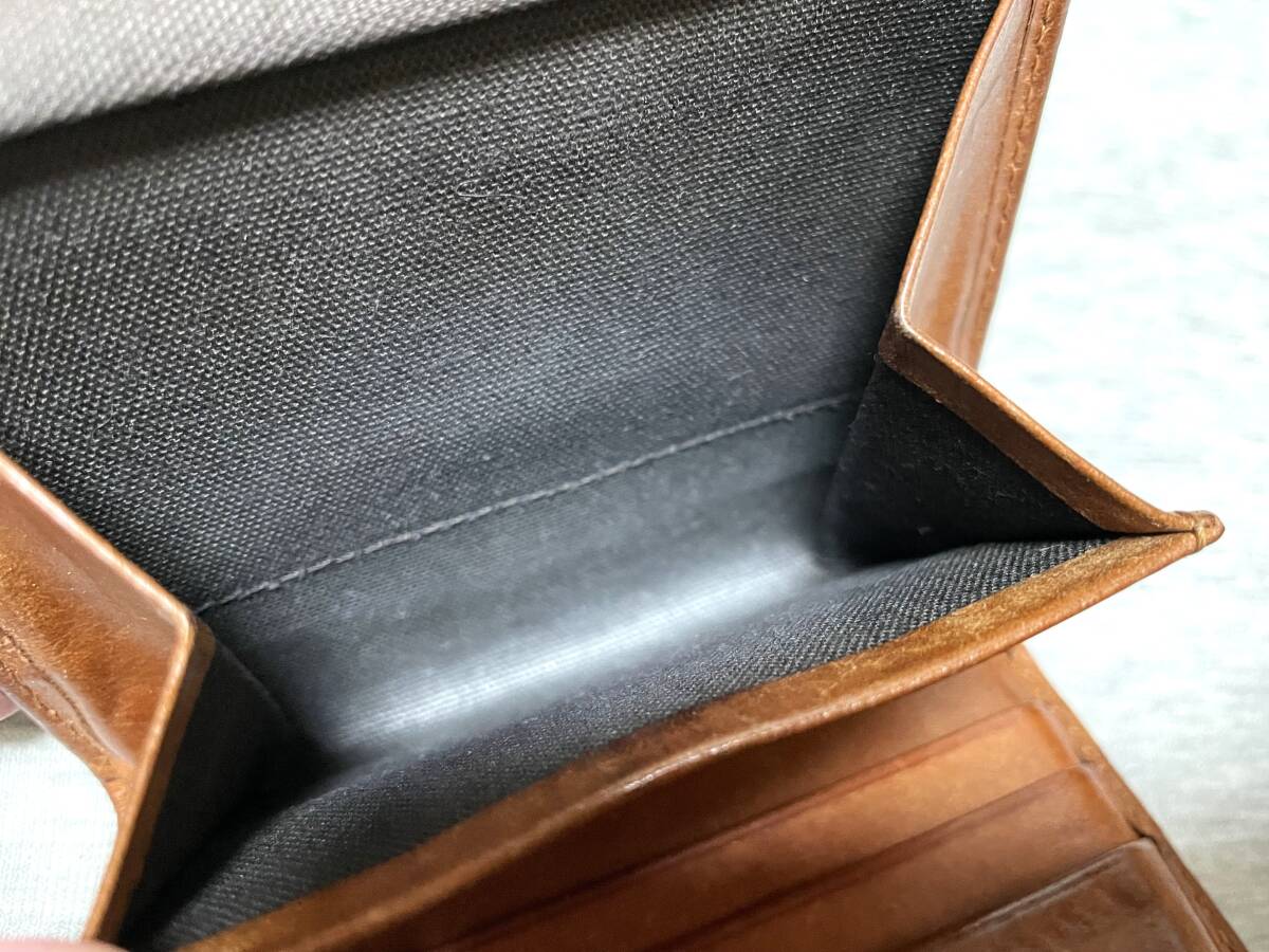 内側(画像3)は、外周部に外側の革が折り込まれる形でトリミングが施されており、一方の面(画像3上部)にはフラップ付きで脇マチが設けられたコインポケットがあり(画像5)、フラップ部には閉じ留め具はございません。