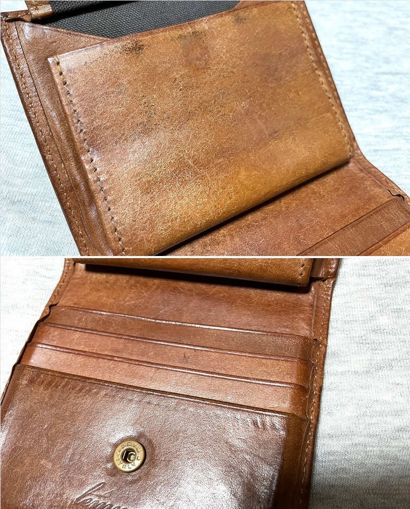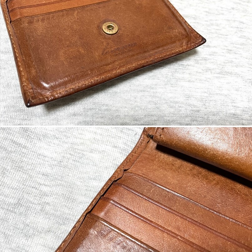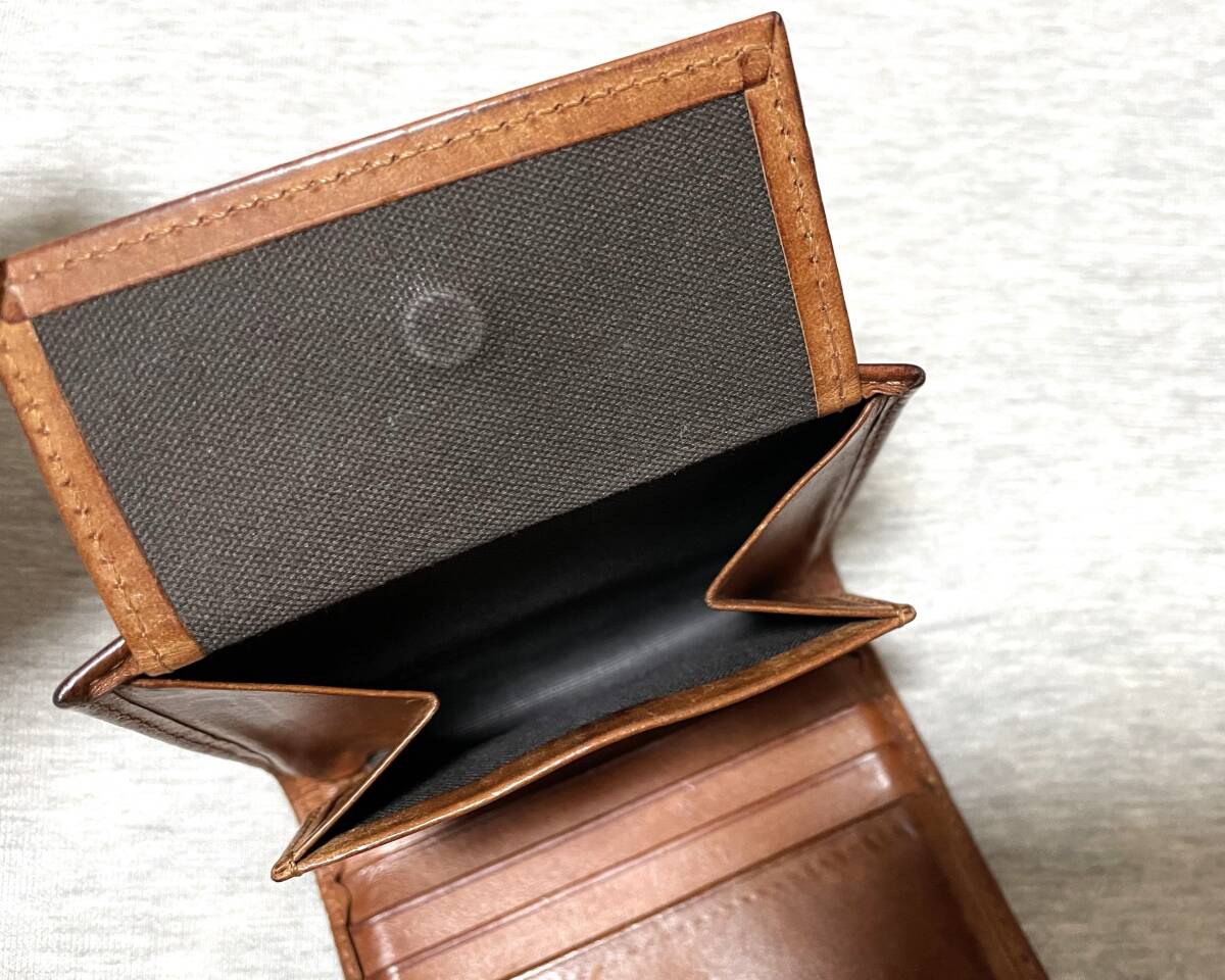 本体に使われている革部分はヤケヌメや飴色と言った感じの茶系の色目で(使用や経年変化による色斑感はございます)、コインポケット内部や各ポケット内部に使われている生地部分はコゲ茶色です。