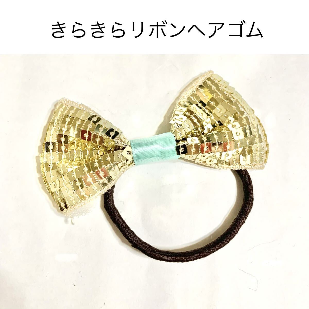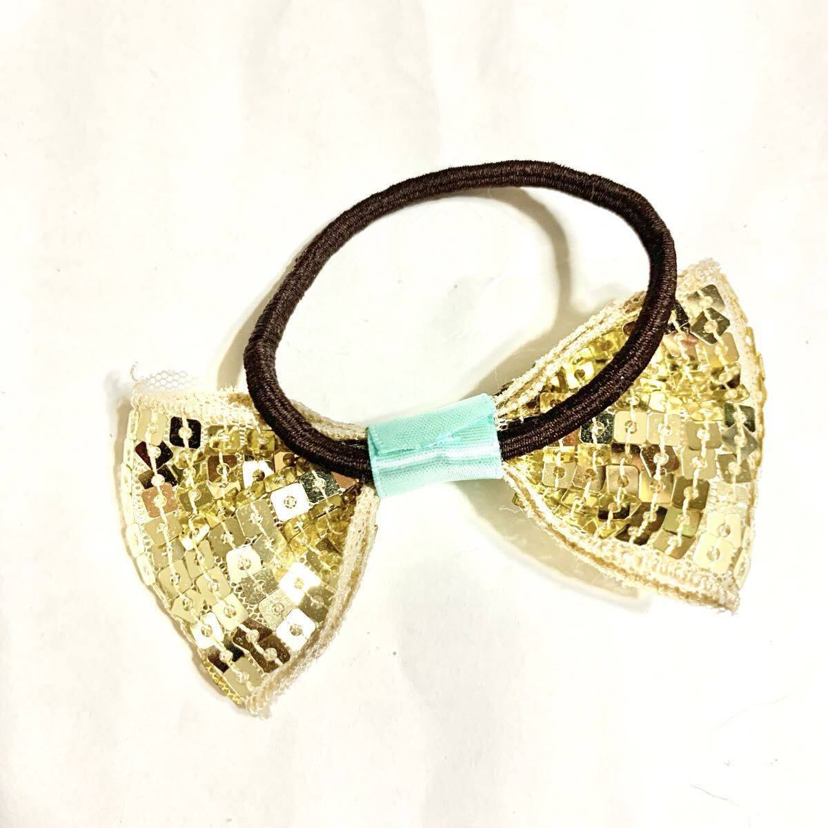 ゴールドのスパンコールがきらきらかわいい、リボン付きのヘアゴム。
