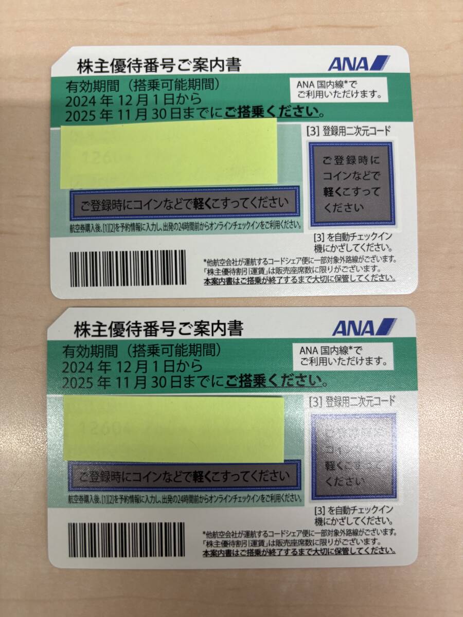 ANAの株主優待券2枚の出品です。利用期間 2024/12/1~2025/11/30