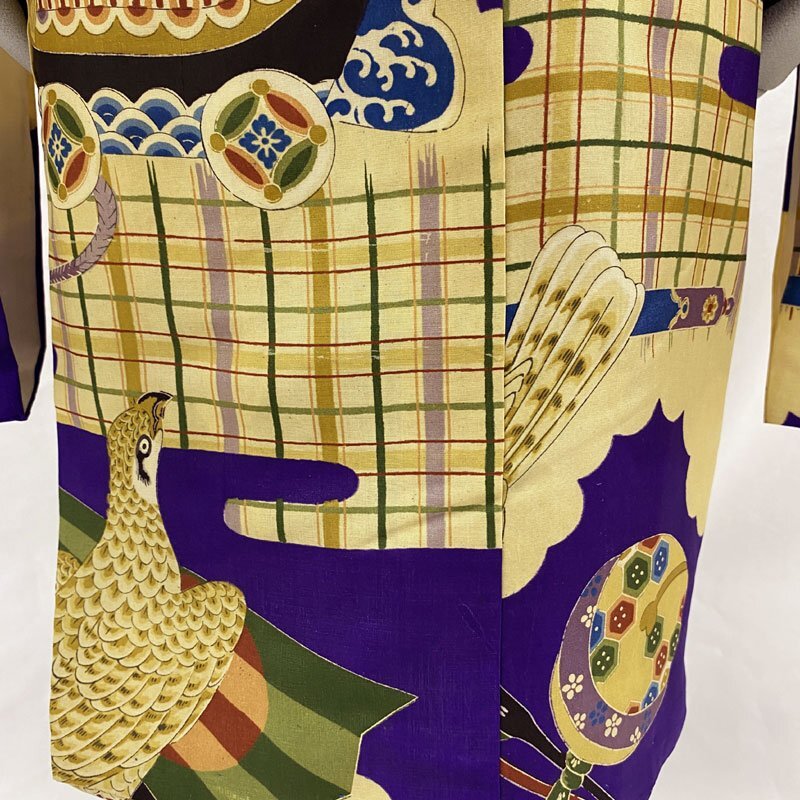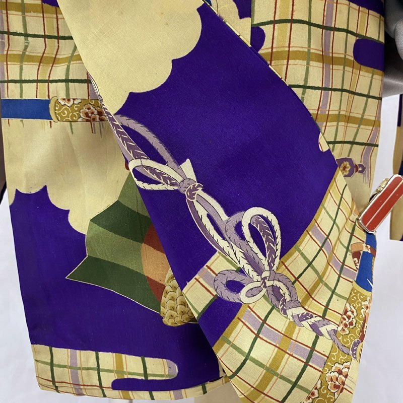◎七五三 三歳 男の子 アンティーク着物&被布 レトロ 濃紫◎ (No.id) こちらの商品は着物、被布です。その他の帽子、楽々衿、ブーツはセットに含まれません。 人気のアンティーク着物にハンドメイドの被布を合わせました。 濃い紫色と桑色の地に、鷹、宝船などの文様が素敵な七五三3歳のアンティークのお着物です。お宮参りの掛け着から使用可能で、3歳七五三まで、体系によっては袴を合わせて5歳の七五三まで長くご使用いただけます。 (着物)一つ身です。画像以外にも薄いシミや染ムラがところどころにございますが、どれも目立ちません。アンティークの風合いとお考え下さい。内側に薄いシミがございますが、内側なので見ません。3歳のお着物として使用する際は、肩上げをしておりませんので、お子様の裄丈に合わせてお直しをお願いします。 (長襦袢)こちらには長襦袢が付属いたしません。3歳の七五三で使用する場合は、長襦袢の代わりにお子様の負担が少なく便利な「子ども用楽々衿」をお勧めします。#ag楽々衿 (被布)着なくなった中古品の化繊着物をリメイクしたハンドメイド品です。ハンドメイド品ですので、完璧を求める方はご遠慮ください。 【表地素材】(着物)正絹、(被布)化繊 【色】濃い紫、桑色 *モニターによって色味は実際と異なる場合がございます。 【サイズ】(着物) 裄:42.5cm、肩上げ幅:-cm、袖幅:24.7cm、袖丈:54.3cm、丈(肩から):96.8cm、腰上げ幅:-cm、前幅:16.3cm、後幅:17.7cm (被布) 幅:34.5cm、丈(肩から):47cm *素人採寸のため、多少の誤差はご容赦ください。 アンティーク着物で古い物ですので、それなりのシミや汚れ、ほつれなどダメージ等あるかと思います。現在出回っているアンティーク着物はシミやアクなどのダメージや手直しなど難がある事の方が多いです。多少の目立たないシミやアクに関しては記載をしておりませんので、ご了承ください。新品同様の綺麗さをご希望の方、少しのシミやアク、ほつれなどアンティークに御理解頂けない方のご購入はお控えいただきますよう、お願いします。 |