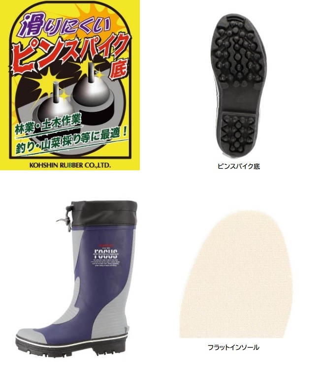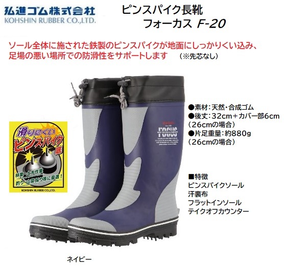 弘進ゴム ピンスパイク長靴 【フォーカス F-20】 を超特価にて提供します ※5000円程度で売られている品が超特価!! 全体に施された鉄製のピンスパイクが地面にしっかりくい込み、 足場の悪い場所での防滑性をサポートします ■カラー :ネイビー ■サイズ:25.0cm