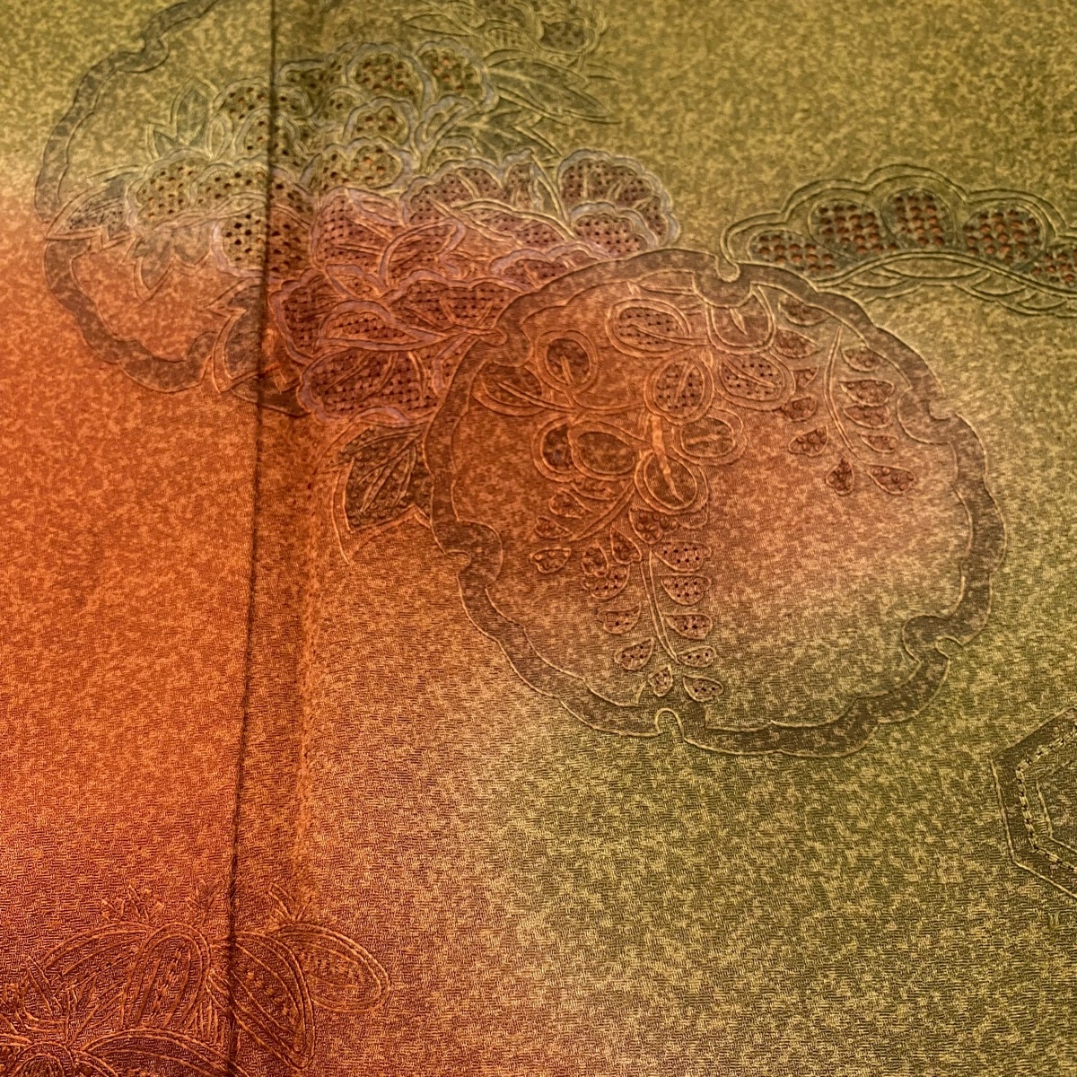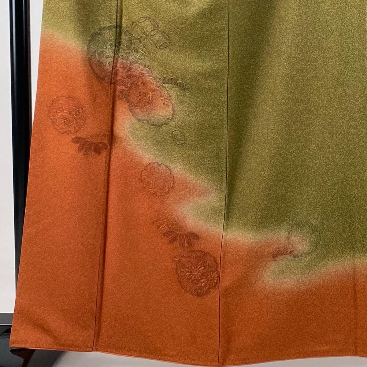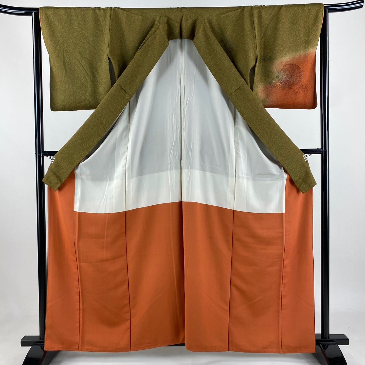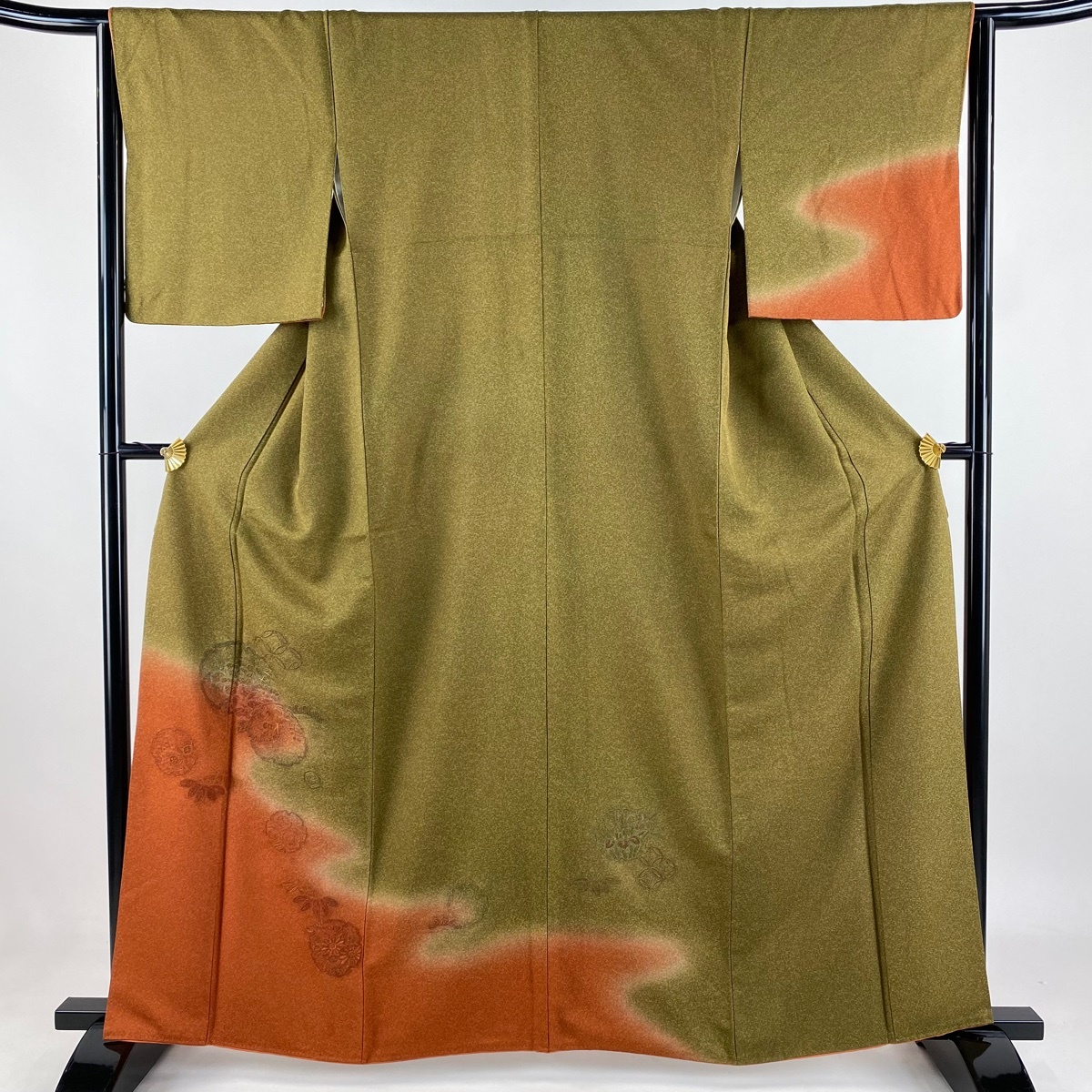 | 付下げ 秀品 雪輪 草花 刺繍 霞ぼかし 鶯色 袷 身丈161.5 裄丈63.5 S 正絹 【中古】 |