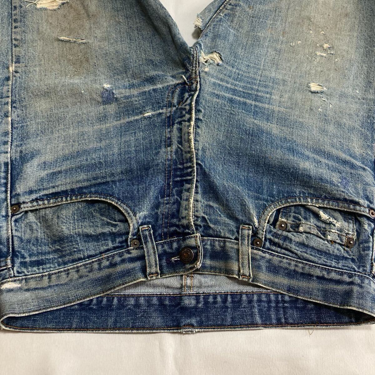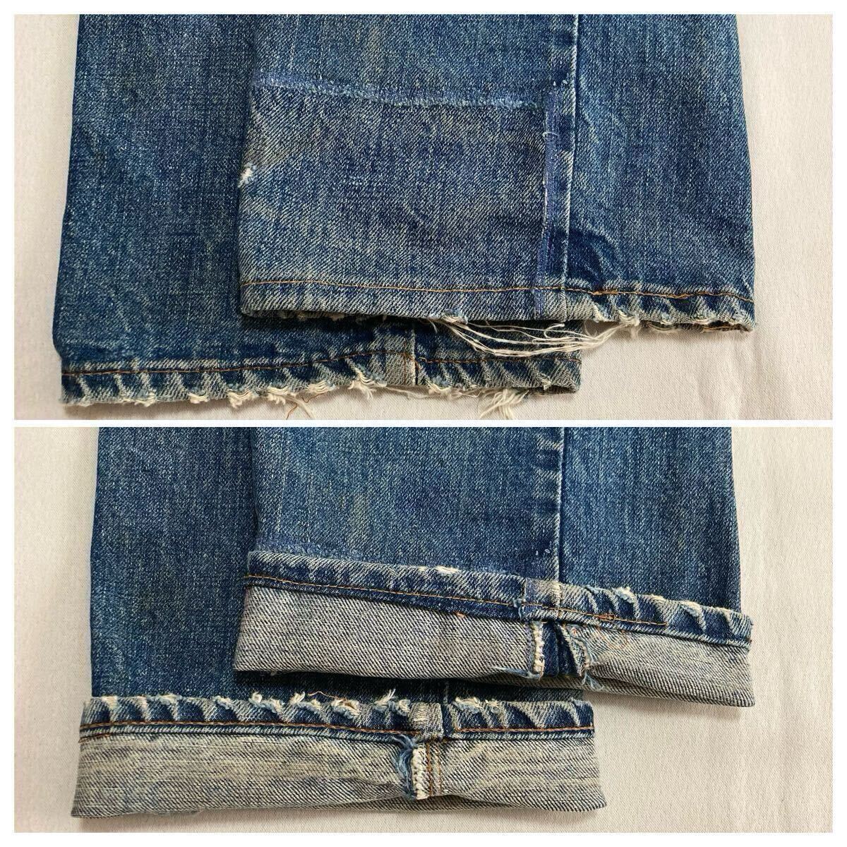 裾は左裾先にデニムを移植したリペアがあり、左裾はシングルステッチでステッチの入れ直しがされています。右裾はチェーンステッチで、両レングス自体はおそらくオリジナルレングスかと思われます。画像にてご判断ください。