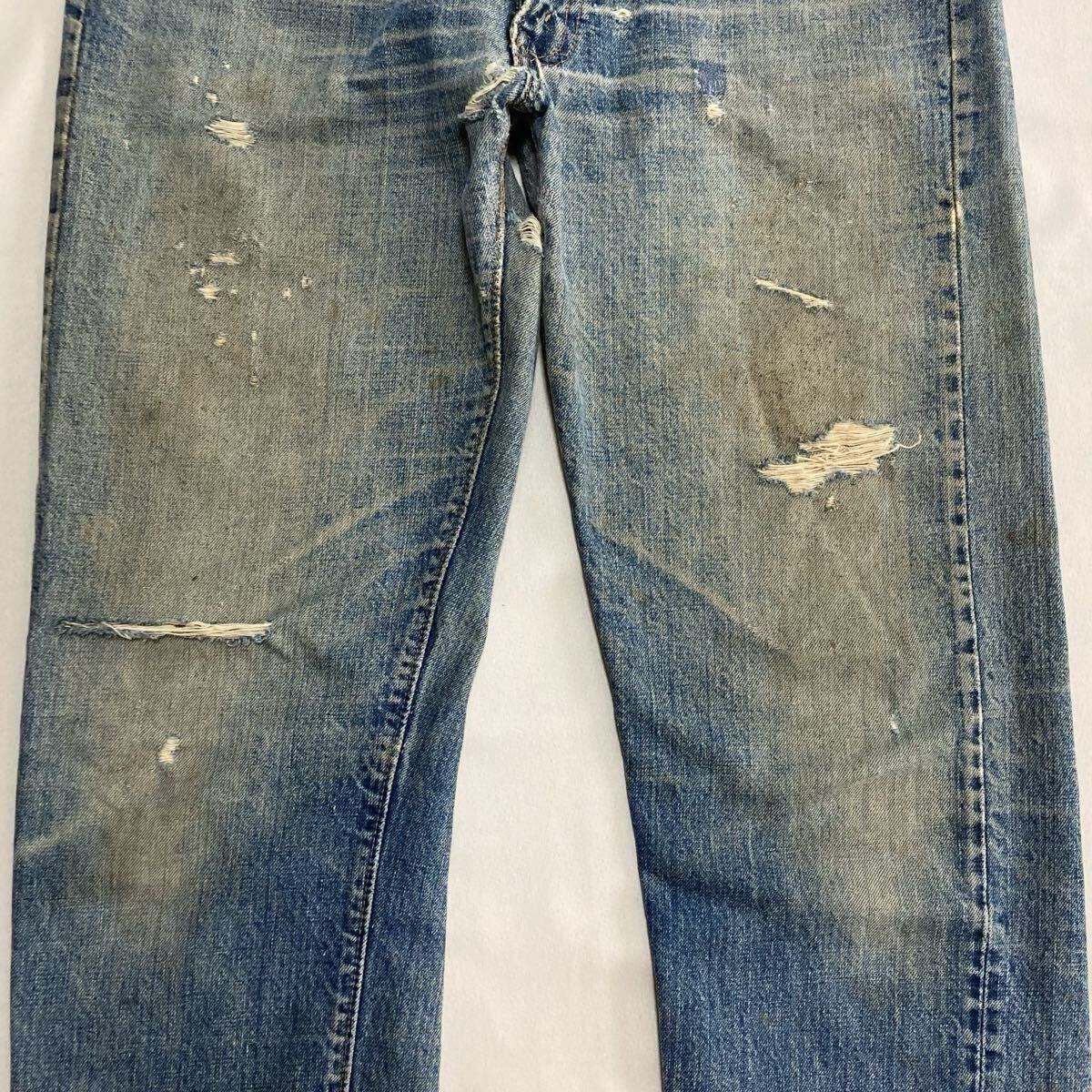股下、内股、膝、太腿、ヒップに破れやリペア、太腿等に油汚れや薄汚れ、コインポケット裏のアルミリベットが一つ欠損しています。