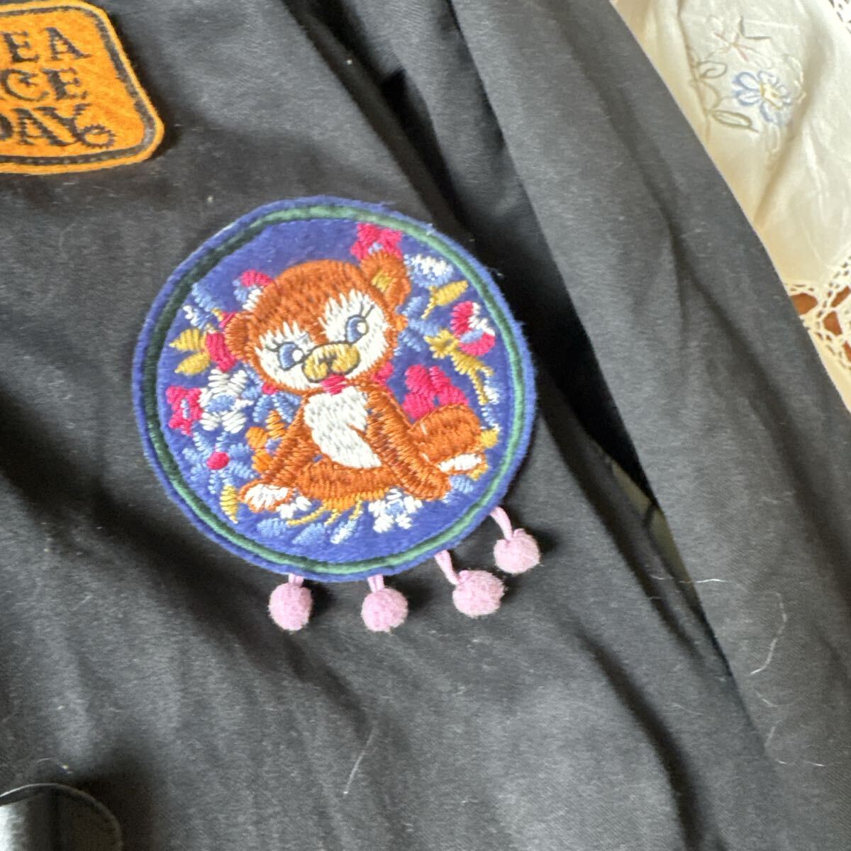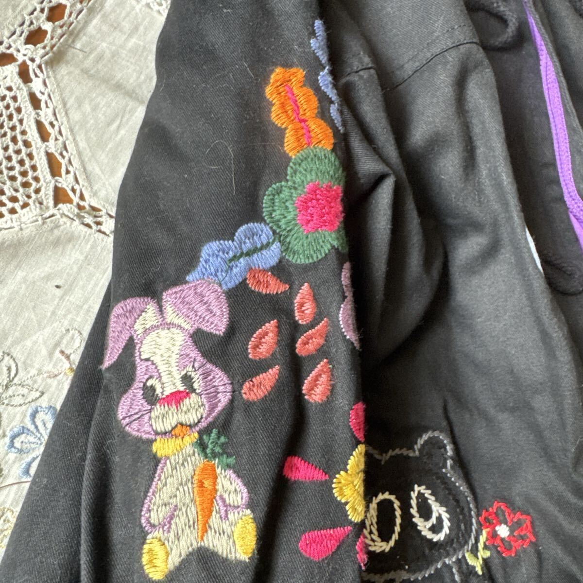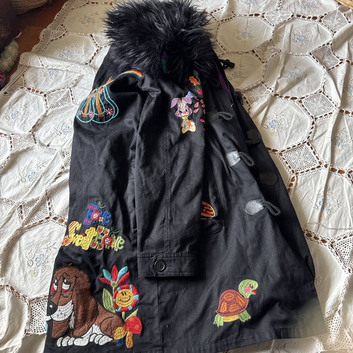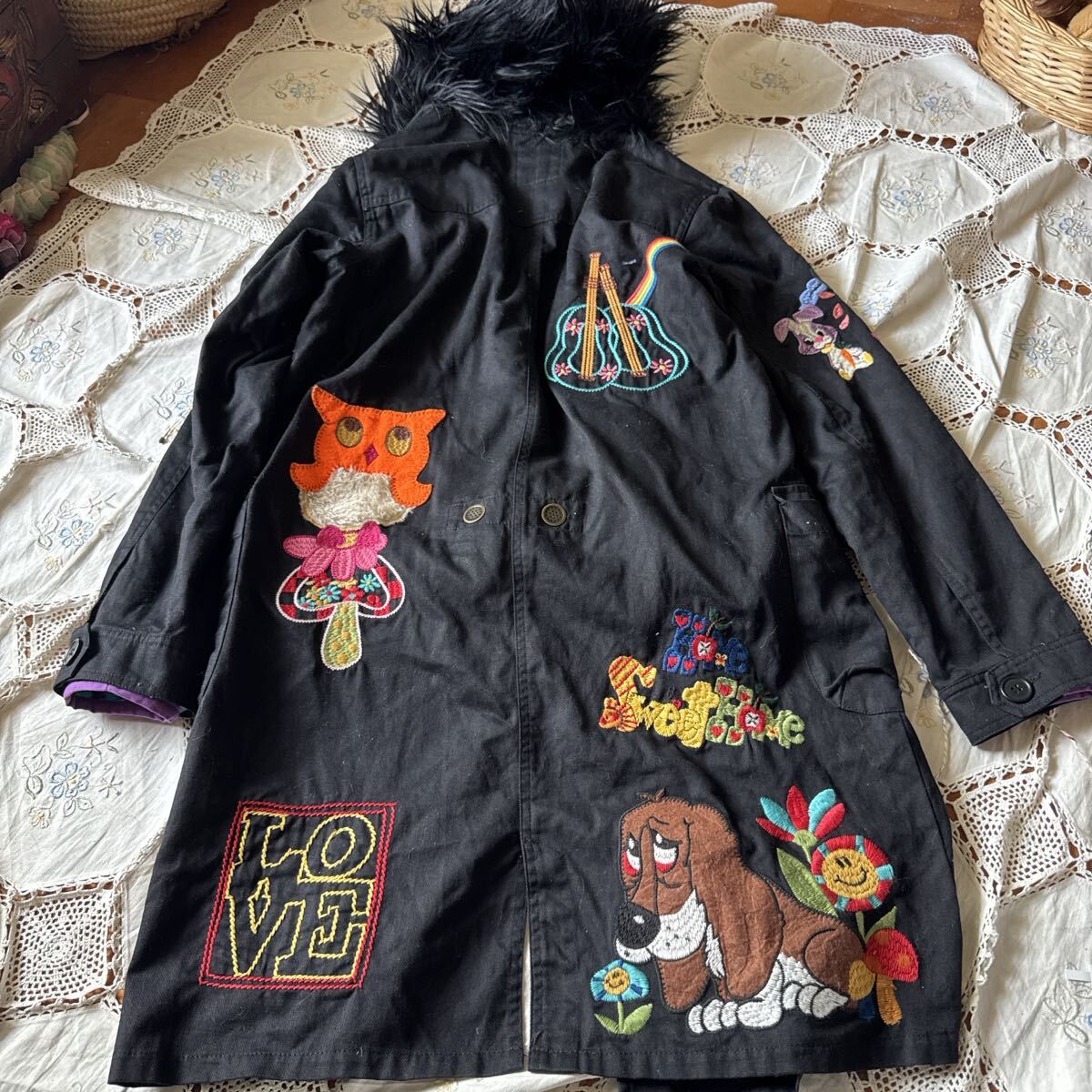 多様なキャラクター刺繍が施されたブラックモッズコート、ファー付きフード付き。