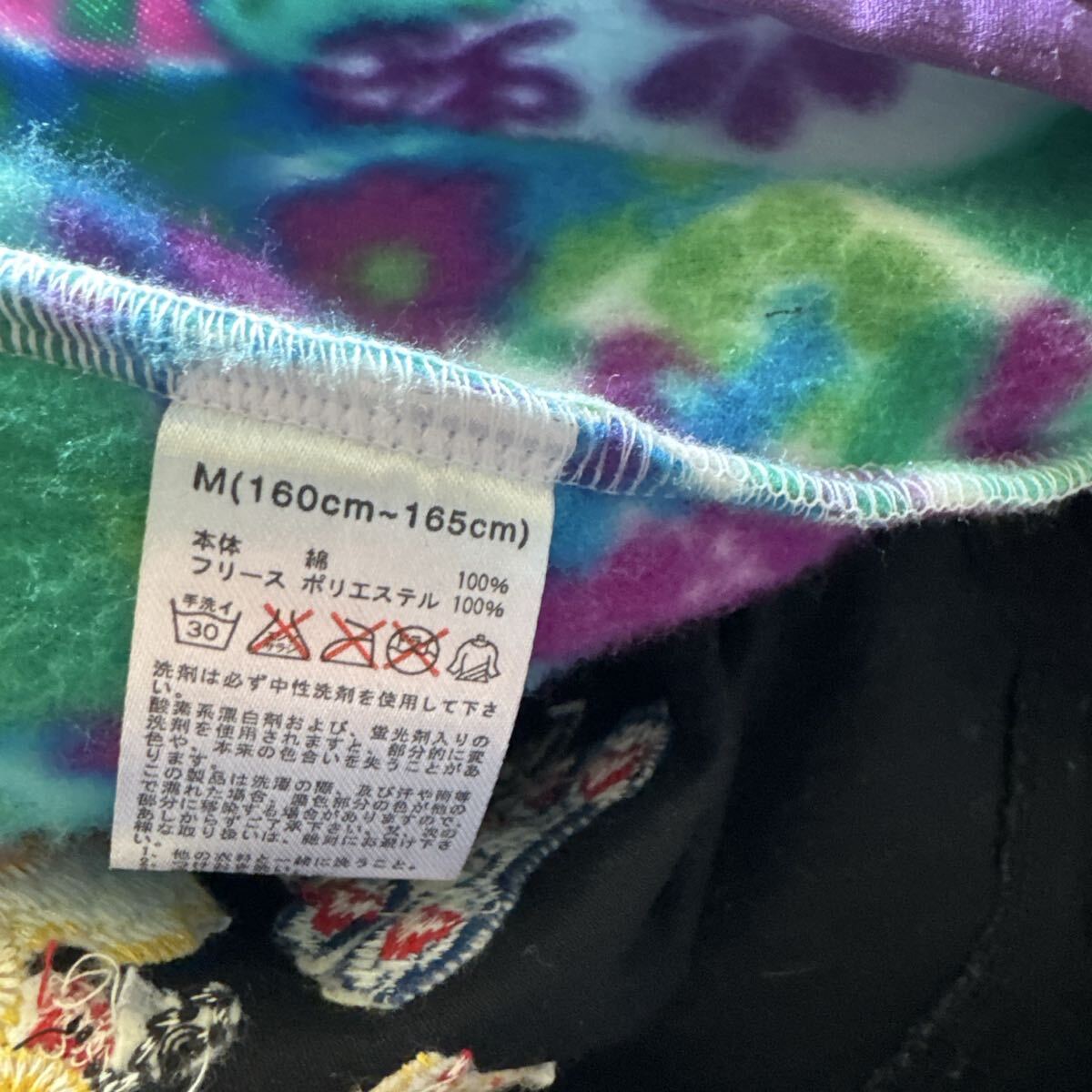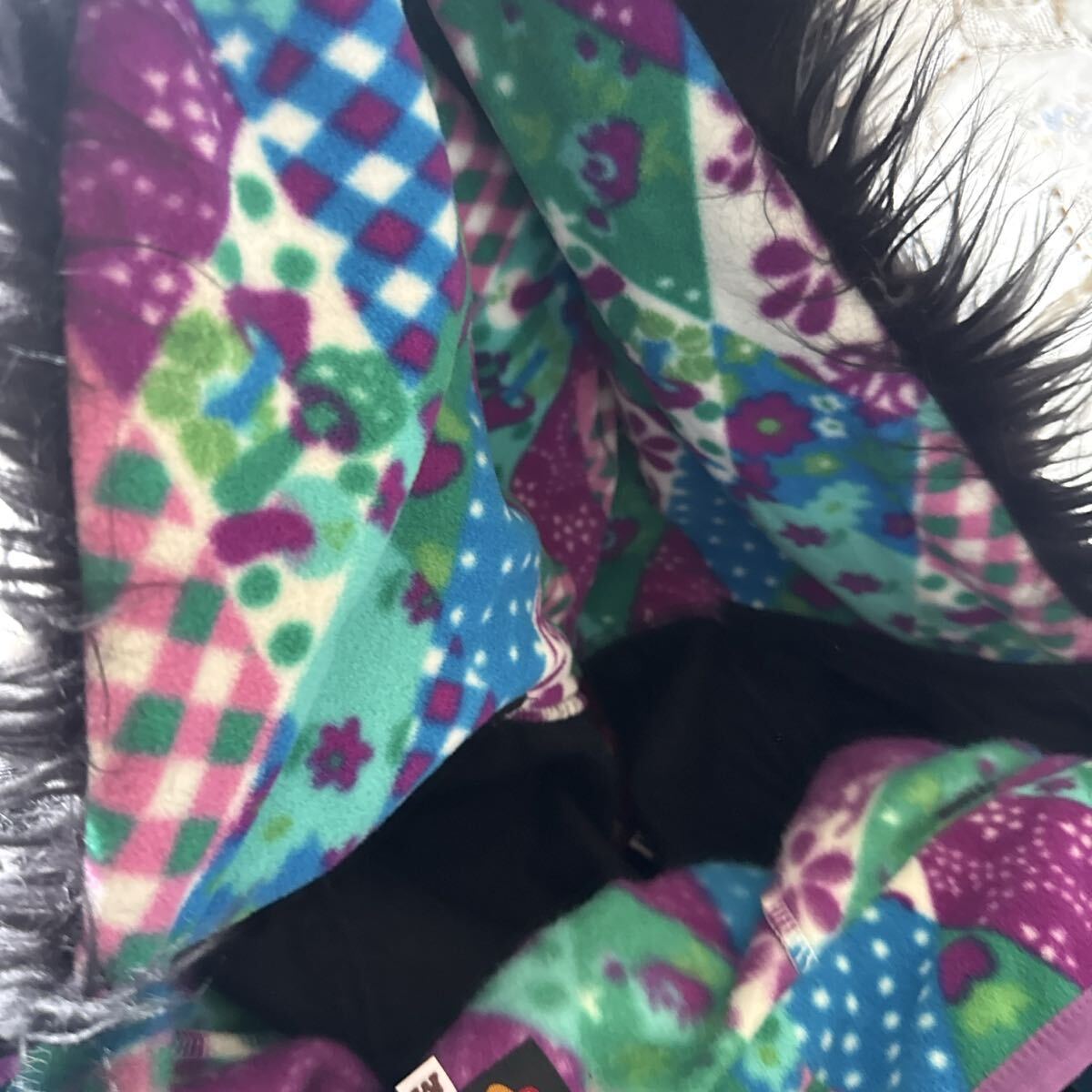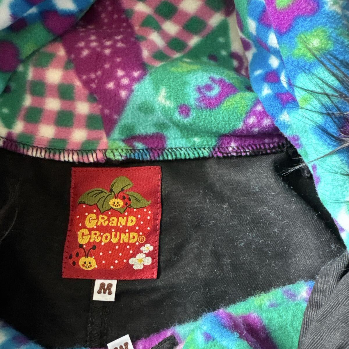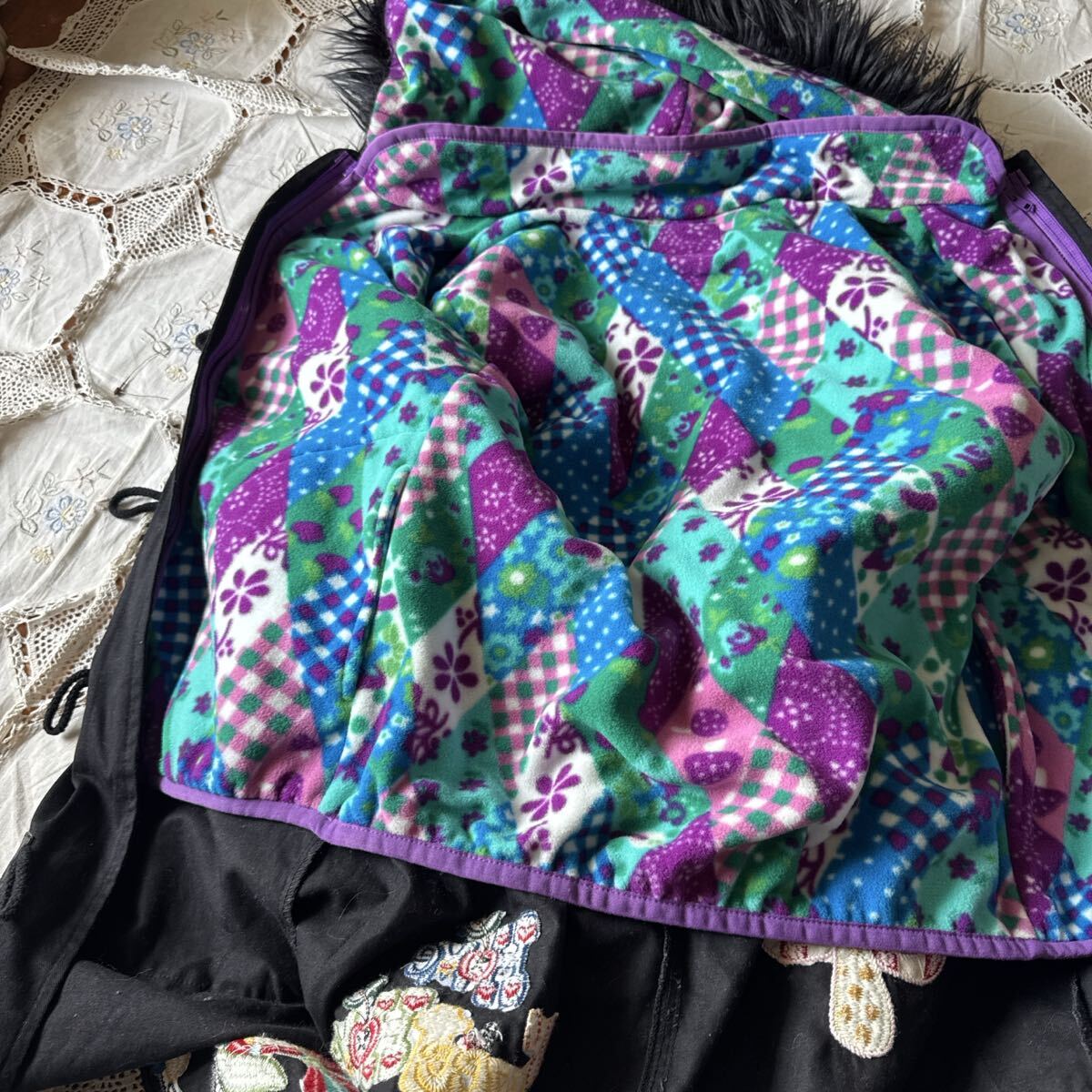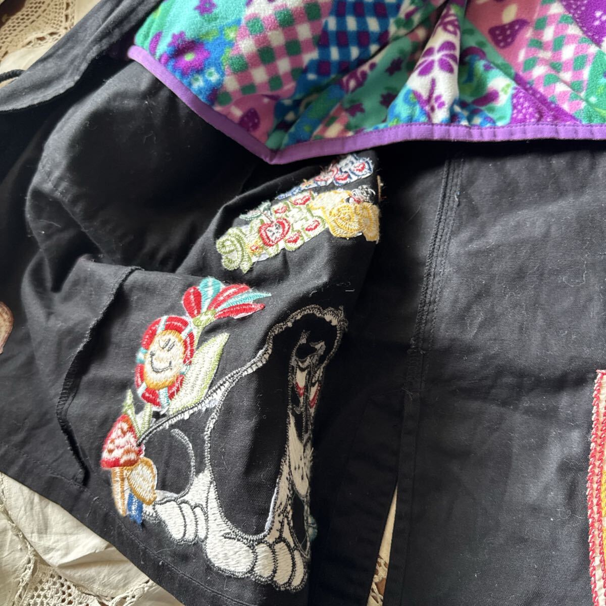 多様なキャラクター刺繍が施されたブラックモッズコート、ファー付きフード付き。
