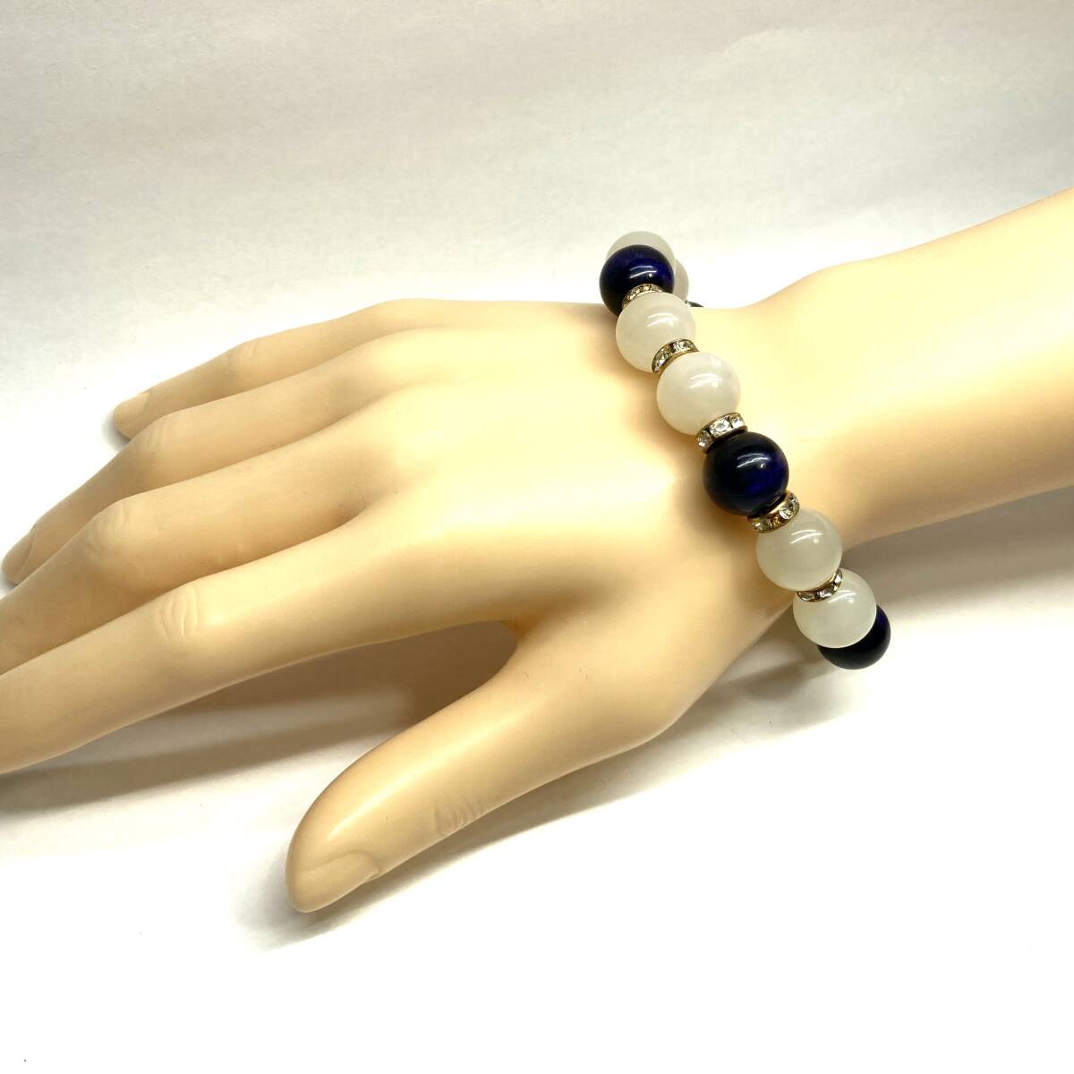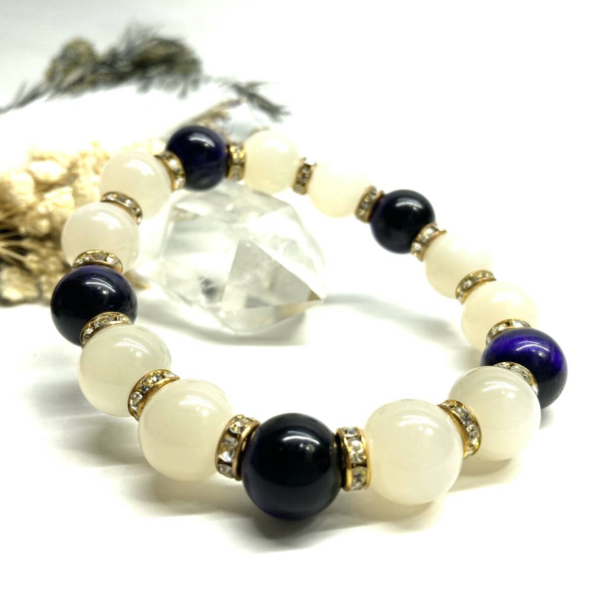 こちらは、ムーンストーンとパープルタイガーアイを組み合わせたパワーストーンブレスレットです。間にはロンデルを挟み高級感あるデザインに仕上げております。程よくインパクトがある12mm玉を使用して内周約18cmです。(サイズ変更の場合は取引ナビにてご連絡をお願いします。) 数に限りがございますので気になる方はお早めにどうぞ。