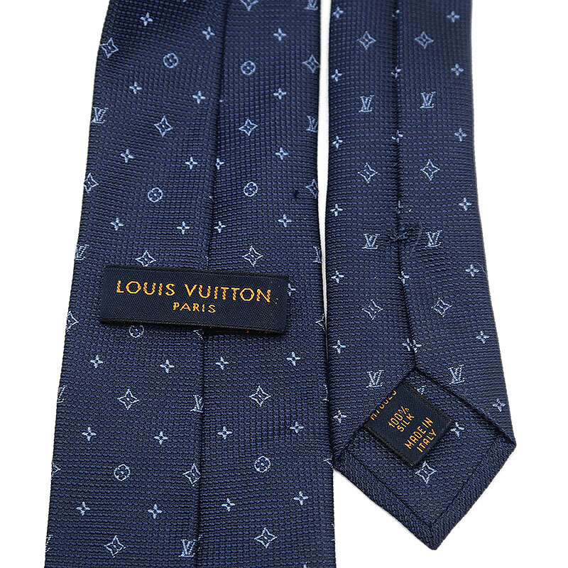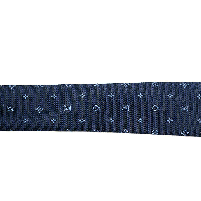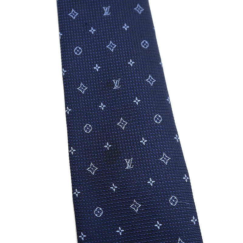 ・小ぶりなモノグラムモチーフがあしらわれたネクタイ。香水の残り香、汚れ、シミが広範囲に見受けられます。また、小さなホツレ箇所あり。大きな破れはありません。
