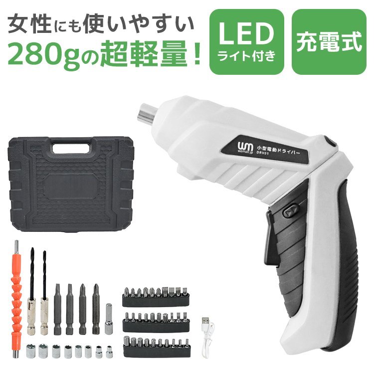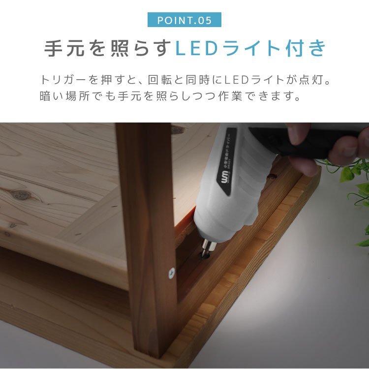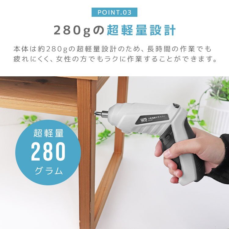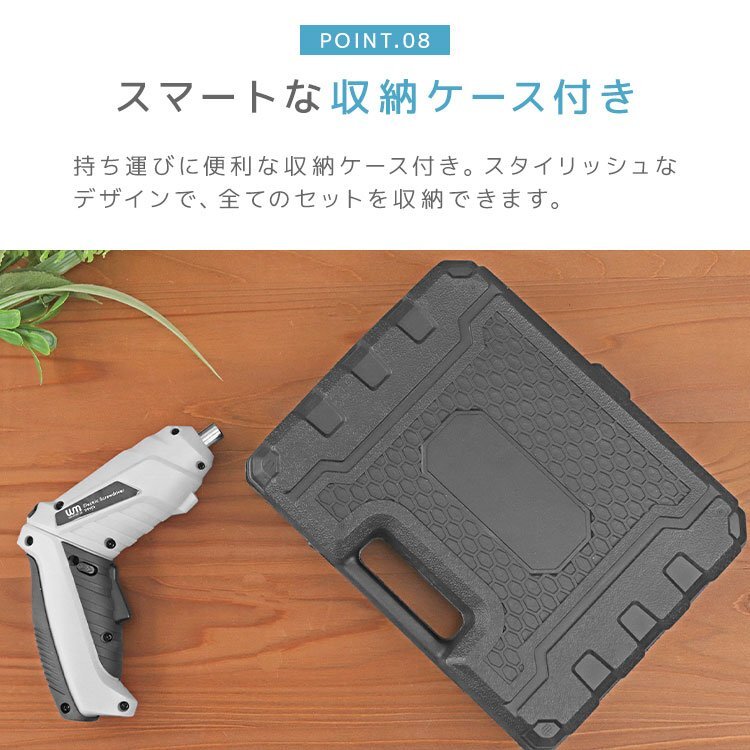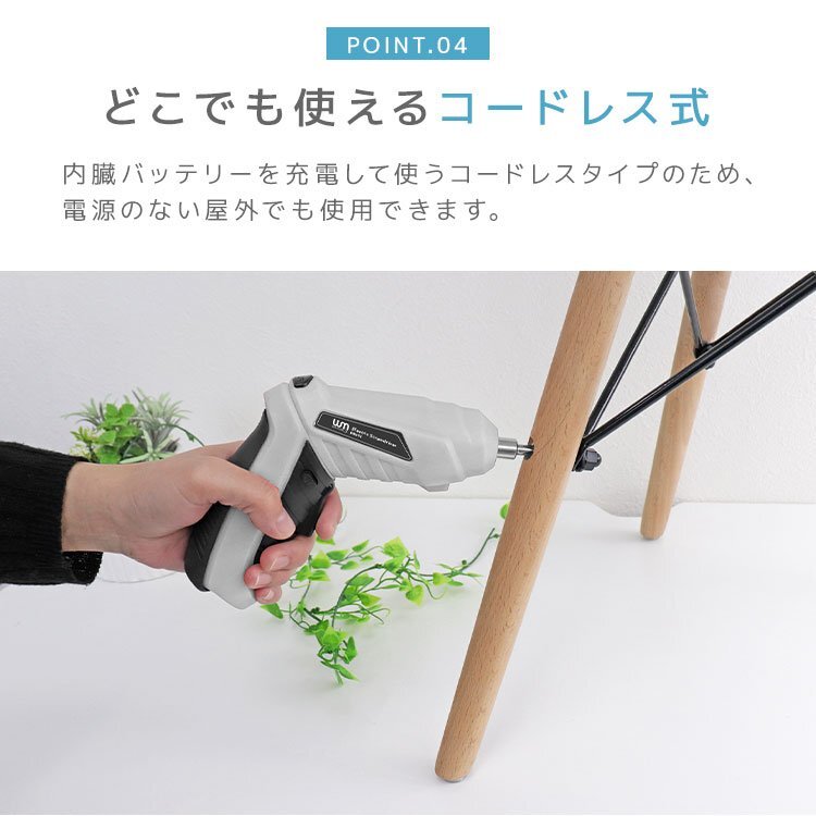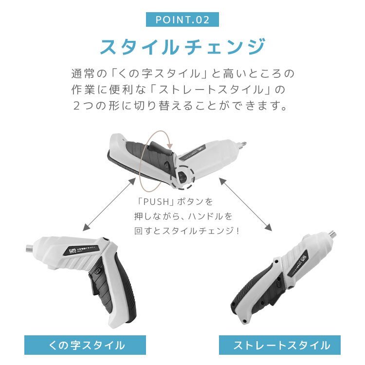 長時間の作業でも疲れにくい電動ドライバーです。 内蔵バッテリーを充電して使うコードレスタイプ! 電源やコード長さを気にせず、どこでもご使用いただけます。 ボタン1つで簡単スタイルチェンジが可能です。 作業する場所に合わせて「くの字」スタイルと「ストレート」スタイルに切り替えできます! 効果的に力を入れることができ、効率よくキレイに仕上がります。 \その他、おすすめポイント/ ・手元を照らすLEDライト搭載 ・便利なフレキシブルシャフト付き ・ボタンで簡単に回転切替可能 ・簡単ビット取り付け ・持ち運びに便利な収納ケース付き セット内容は詳細画像をご確認ください。 【商品仕様】 カラー:グレー 重量:(約)280g 材質:プラスチックABS、鉄 サイズ(約) 全長:21.5cm ケース:横23.5cm×縦18.5cm×奥行6.5cm (ドライバ 電動ドライバ 小型ドライバ ペンドライバ ペンドライバー ドライバーセット 小型ドライバーセット ドリル 電動ドリル 小型ドリル ミニドリル 工具 2WAY 変形 軽量 LEDライト ケース おしゃれ かわいい 人気 おすすめ ウェイモール WEIMALL) |