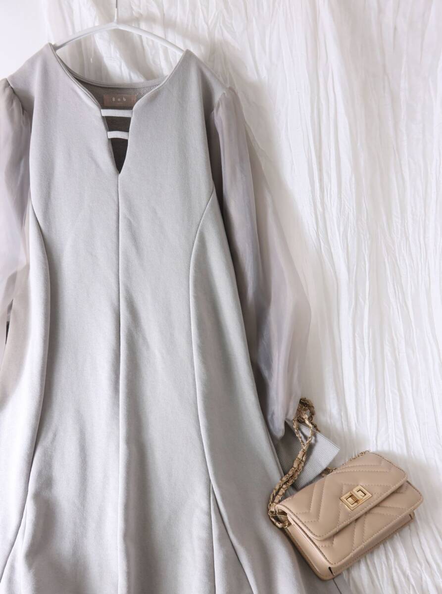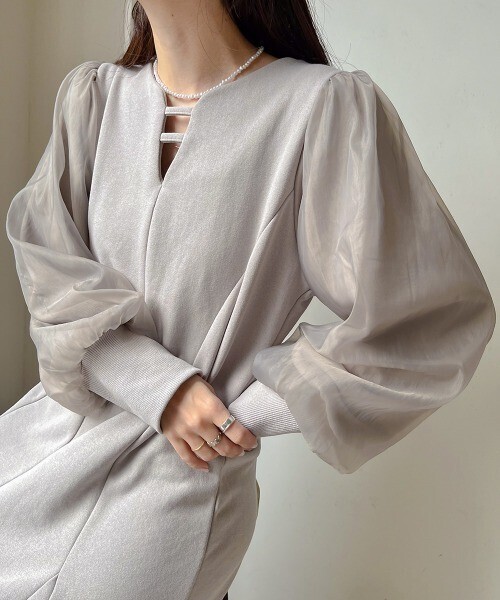 光沢のあるオーガンジーをあしらった袖が、程よいボリュームで華奢見えを叶えます。袖が二重になっている事により肌の透け感が無く、春夏のシアー感とは一味違った雰囲気をお楽しみ頂けます。フロントの丸みを帯びたキーネックと落ち感の良いフレアシルエットで、細部のデザインまで凝った1枚。