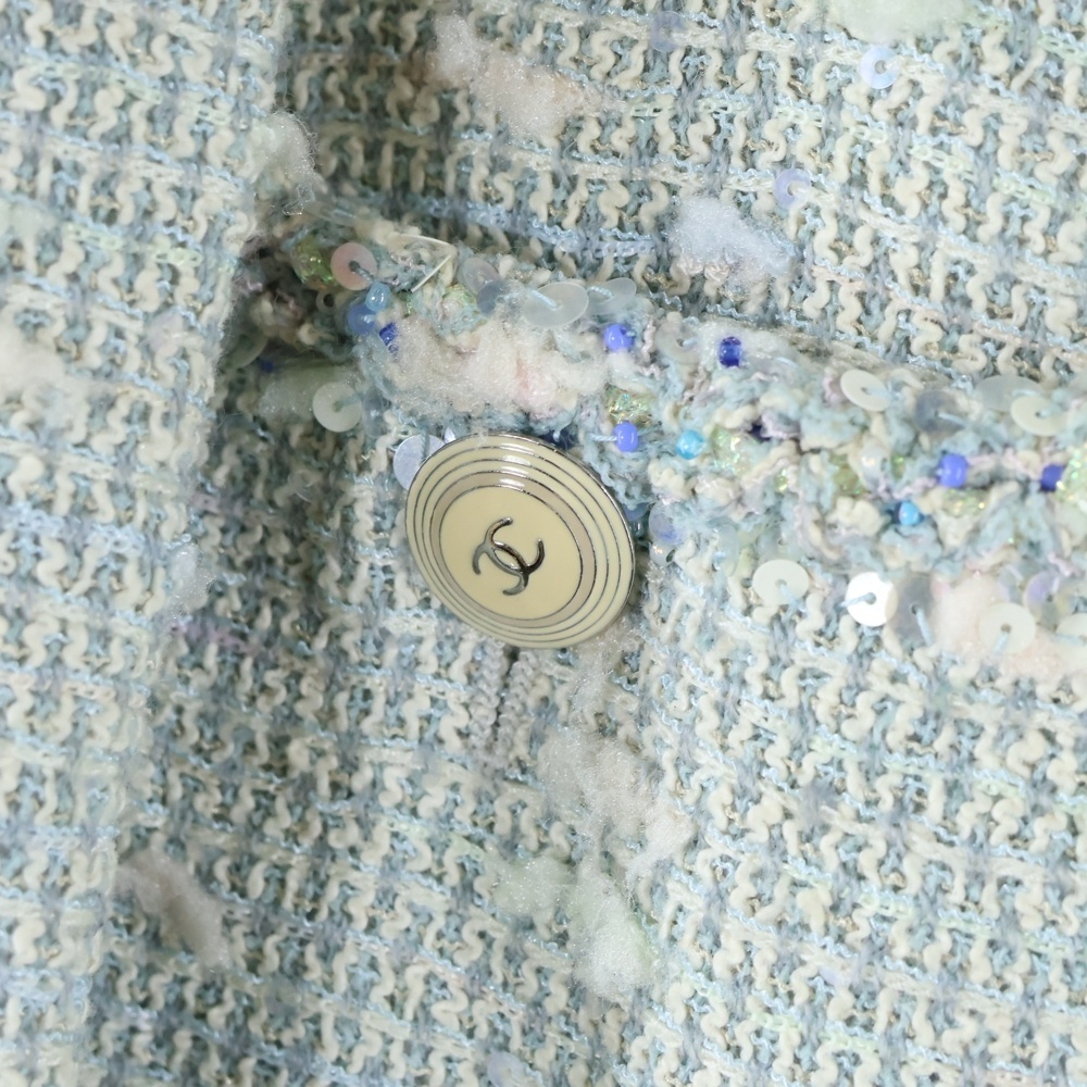 品名07C クルーズコレクション ココマークボタン ストーン スパンコール 装飾 ファンシーツイード ノーカラー ジャケット ライトブルー レディース P29904V16316