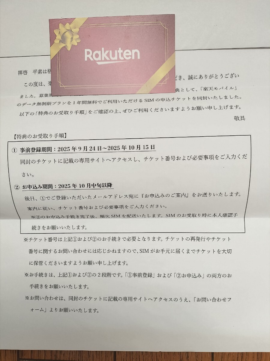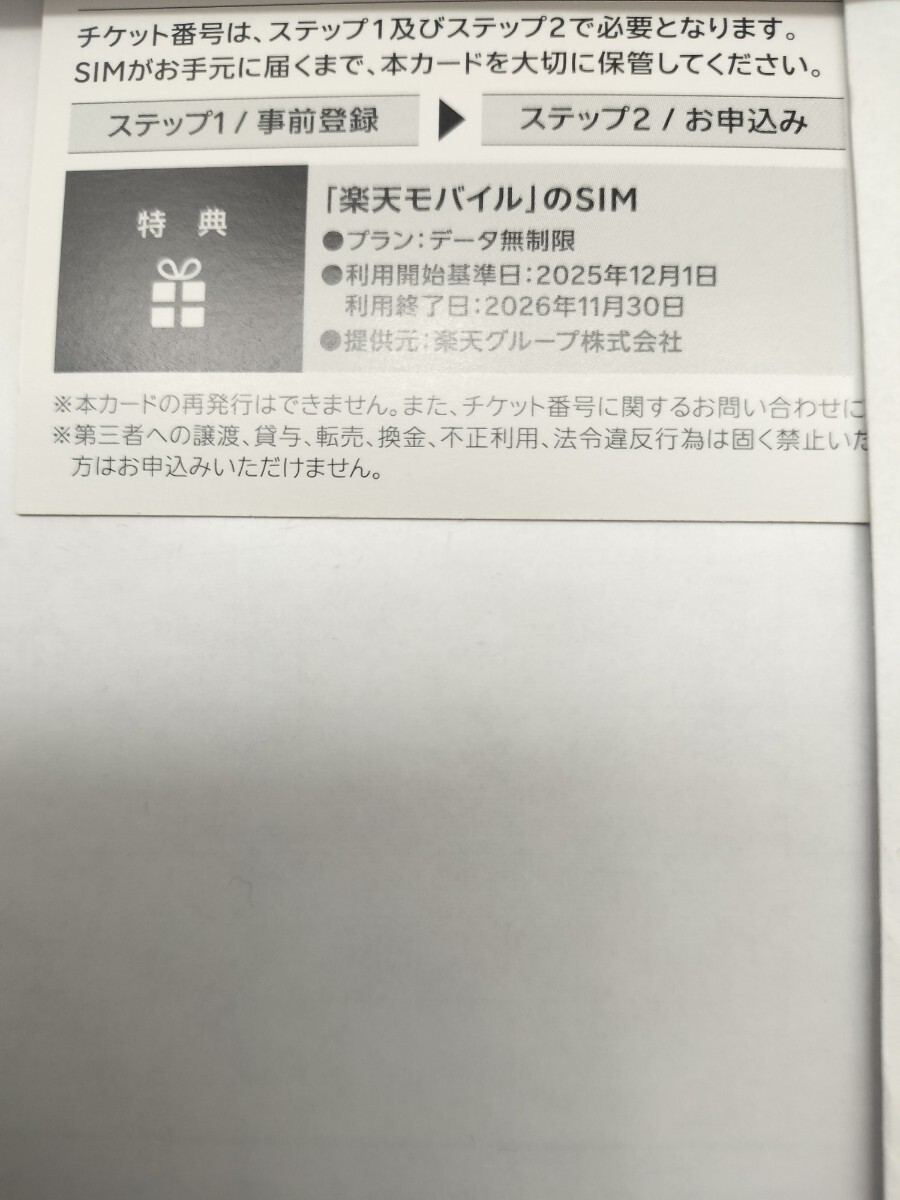 楽天モバイル★ eSIM or SIMカード★データ無制限プラン★1年間無料 申込チケット 匿名配送