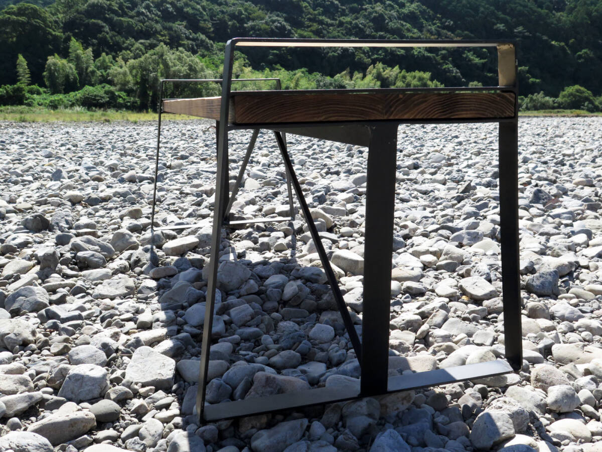 サイドの鉄脚は5mm厚のフラットバーを斜めに角度を合わせ溶接し八の字にして安定感をだしました。
