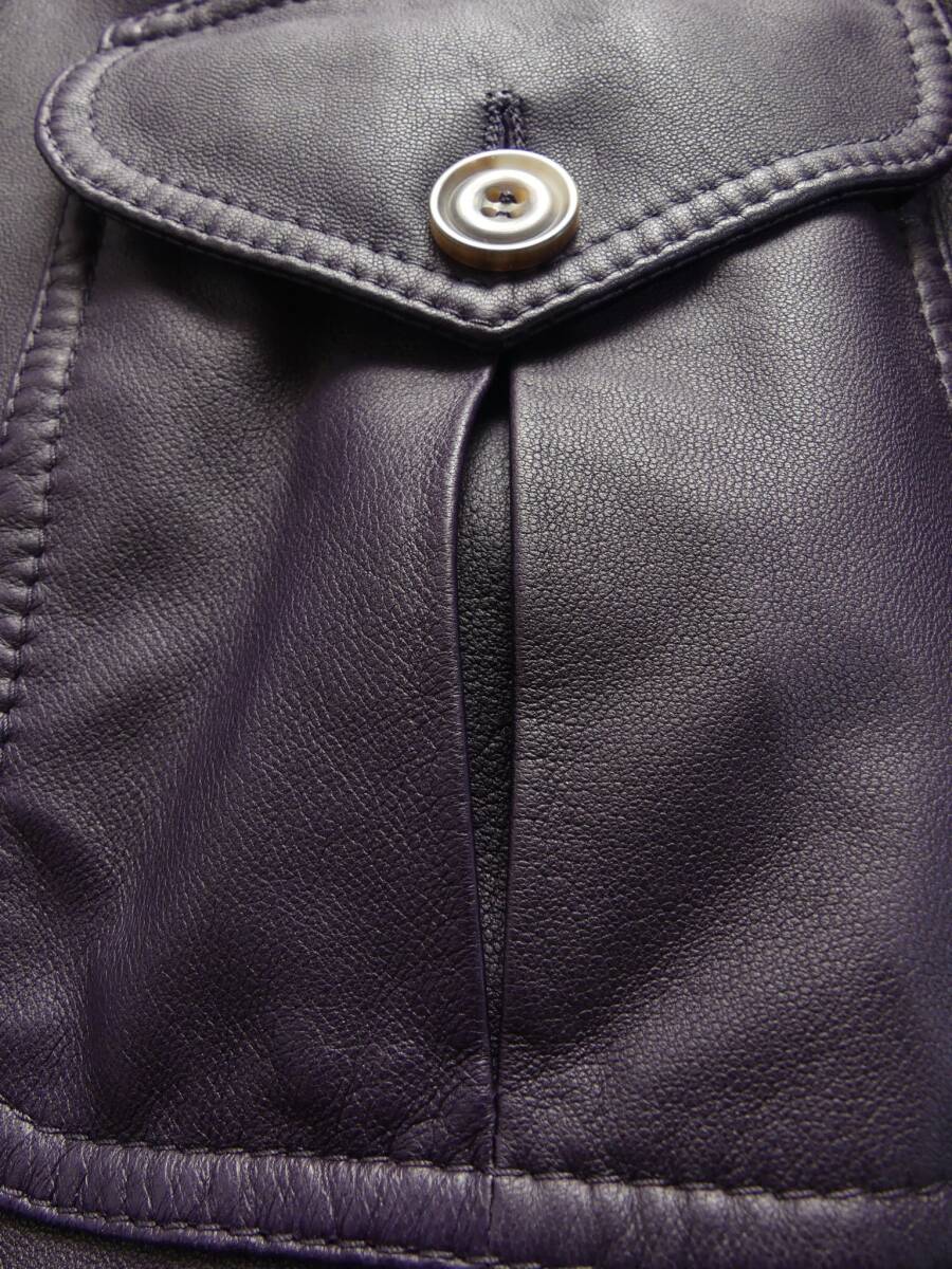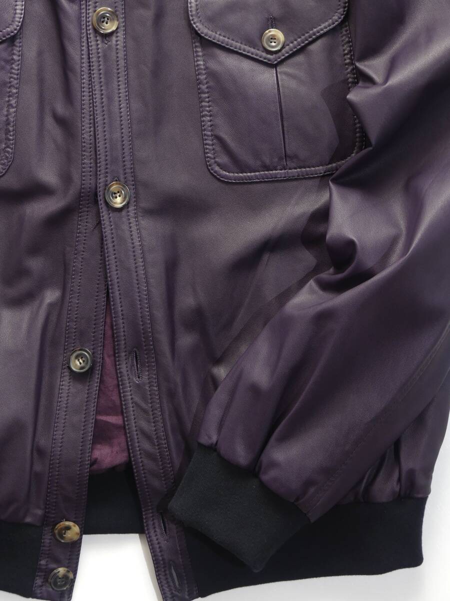 ジョルジオのレザーはいつも驚かされる何かがあります。今回のお品は何といってもレザーそのものの質が比類無いくらいに良いことです。まるで生きている革のように伸縮性が高く、バンザイしても引っ張られず、肘を曲げた時のツッパリも無し。革ってゴワツク感じがありますが、その感覚はまったく無く、こんなに気持ちの良い、着心地の良いレザーがあることに驚かされます。お洒落具合も抜きん出た出来栄え。色も人と決して被らない個性的なダークパープル。派手な紫ではなく落ち着いたシックな色合いで、ご覧のとおりとても洒落ています。こんなレザージャケットを色落ちしたジーンズに合わせて、自然な雰囲気でキメ感なく着こなしたいですね。紫は青に特に映えますので、ジーンズは抜群に相性の良いボトムになります。着用シーズンは11月からでしょうか。保温材が施されていない比較的軽いアウターになりますが、風を通さないレザーですので結果として保温性があります。11月から3月まで秋冬そして初春が着用シーズンの上着になります。