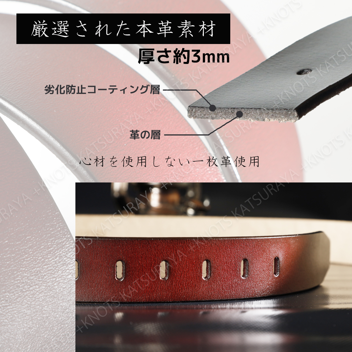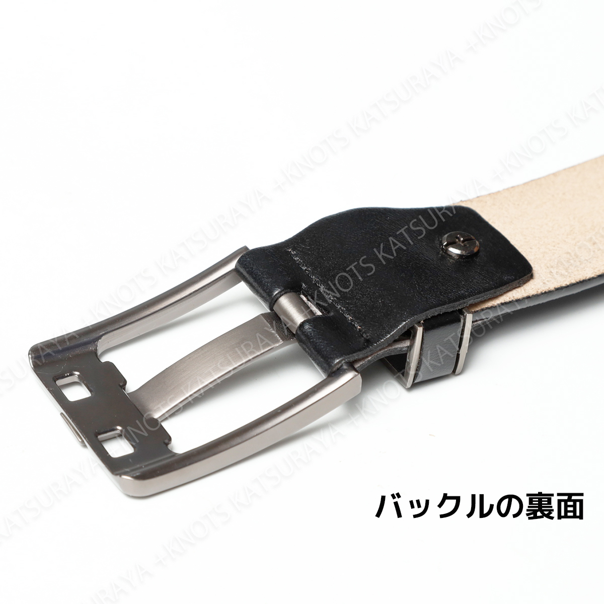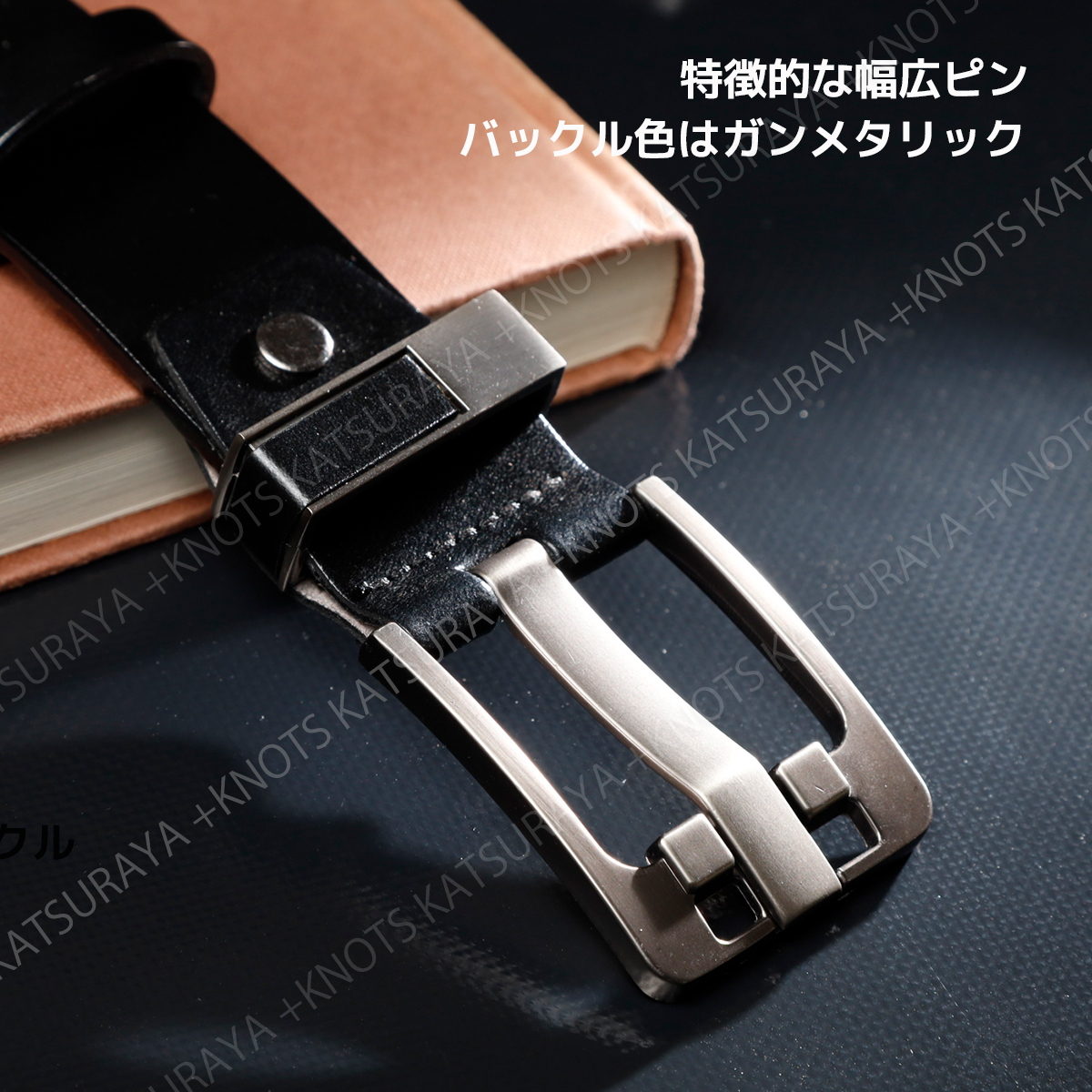幅広ピンが特徴的、重厚デザインの本革ベルトです。張り合わせのない一枚の革を使用したしなやかな帯は幅37mmとやや太めです。デニムやチノパンなど様々なカジュアルスタイルと相性が良く幅広い年代の方におすすめです。長さの調整はバックル部のネジを外しハサミで切断後に中央に穴をあけることで行えます。