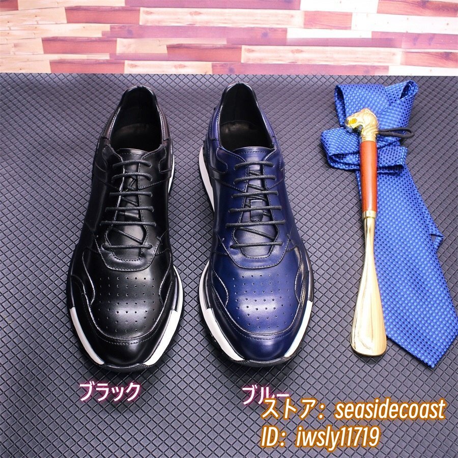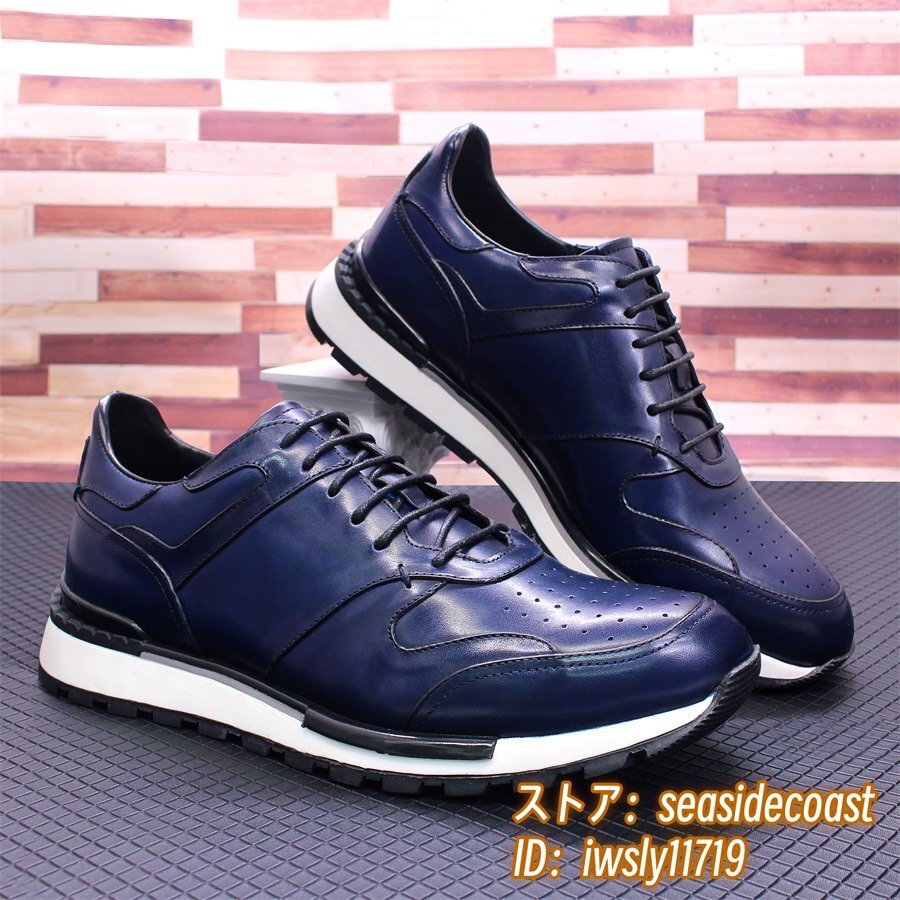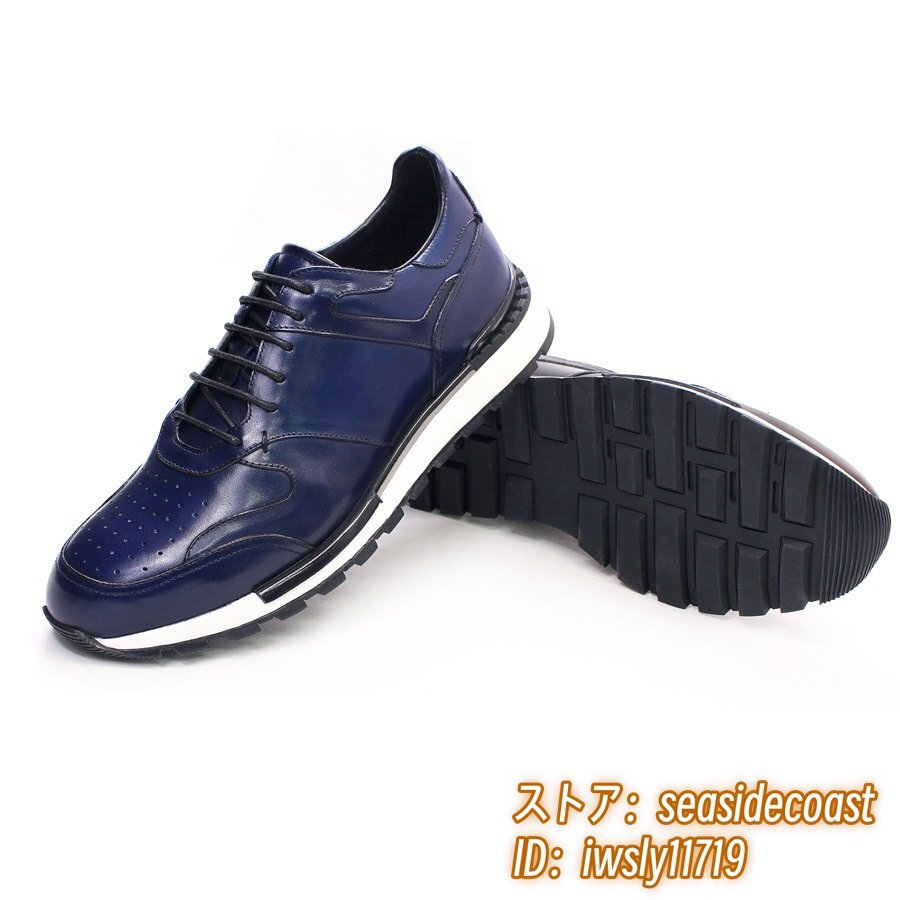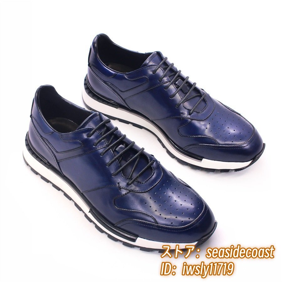 定価9万◆最高級 スニーカー メンズ 厚底 ローファー ビジネスシューズ 職人手塗り上げ 彫り 牛革 革靴 スリッポン 運動靴 ブルー 28.0cm