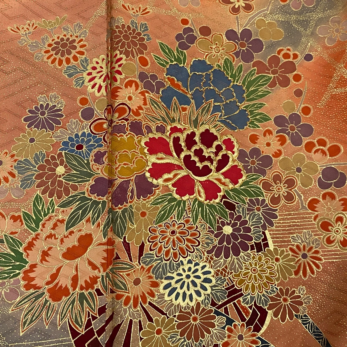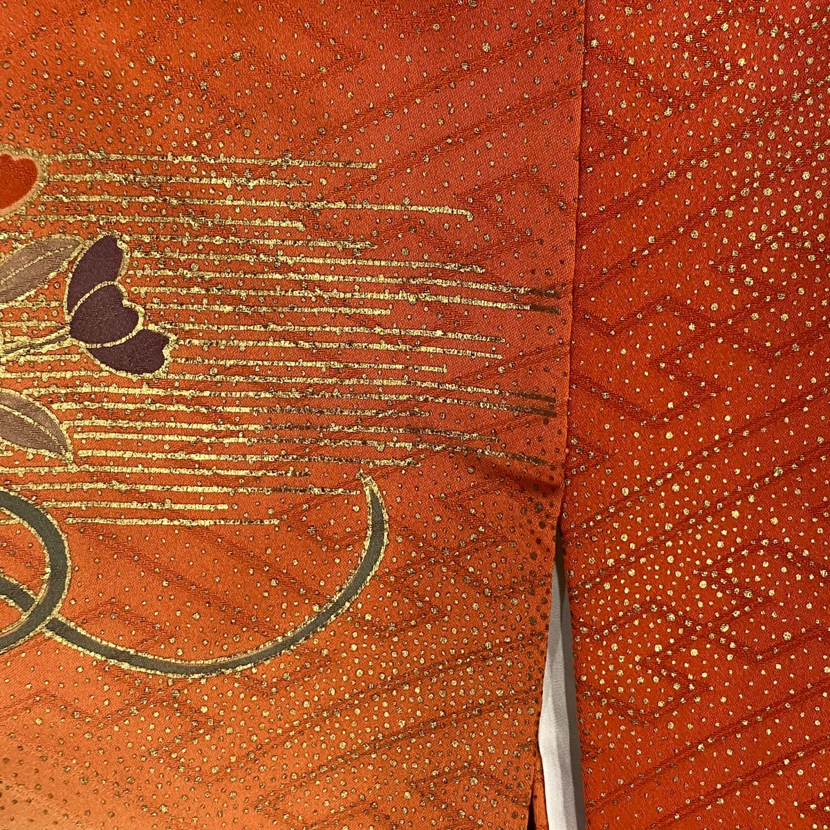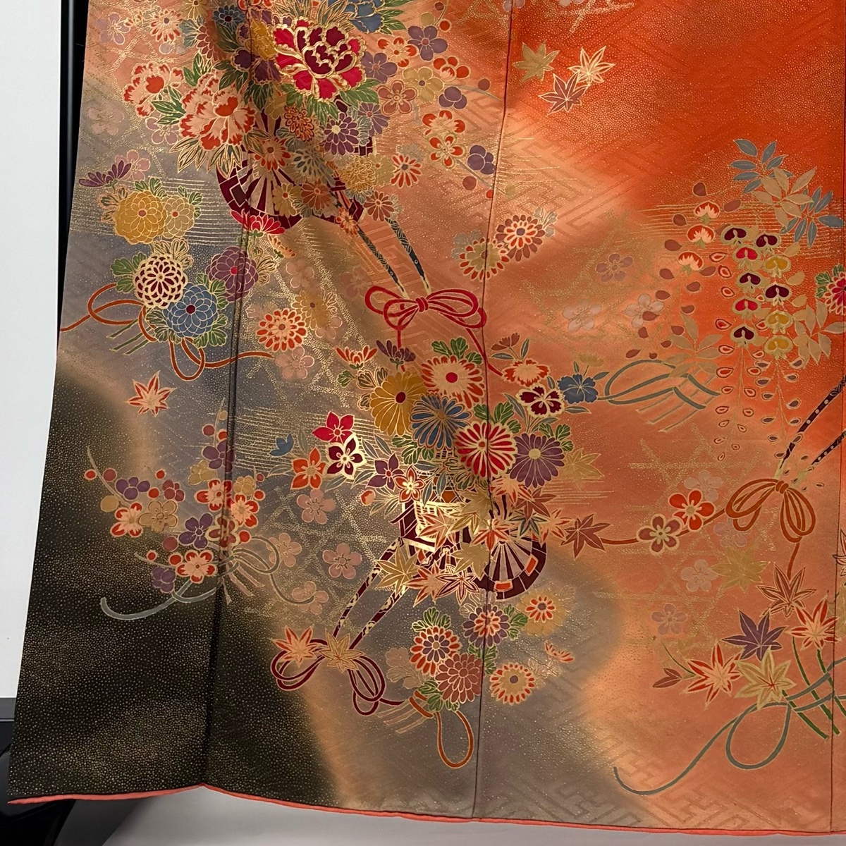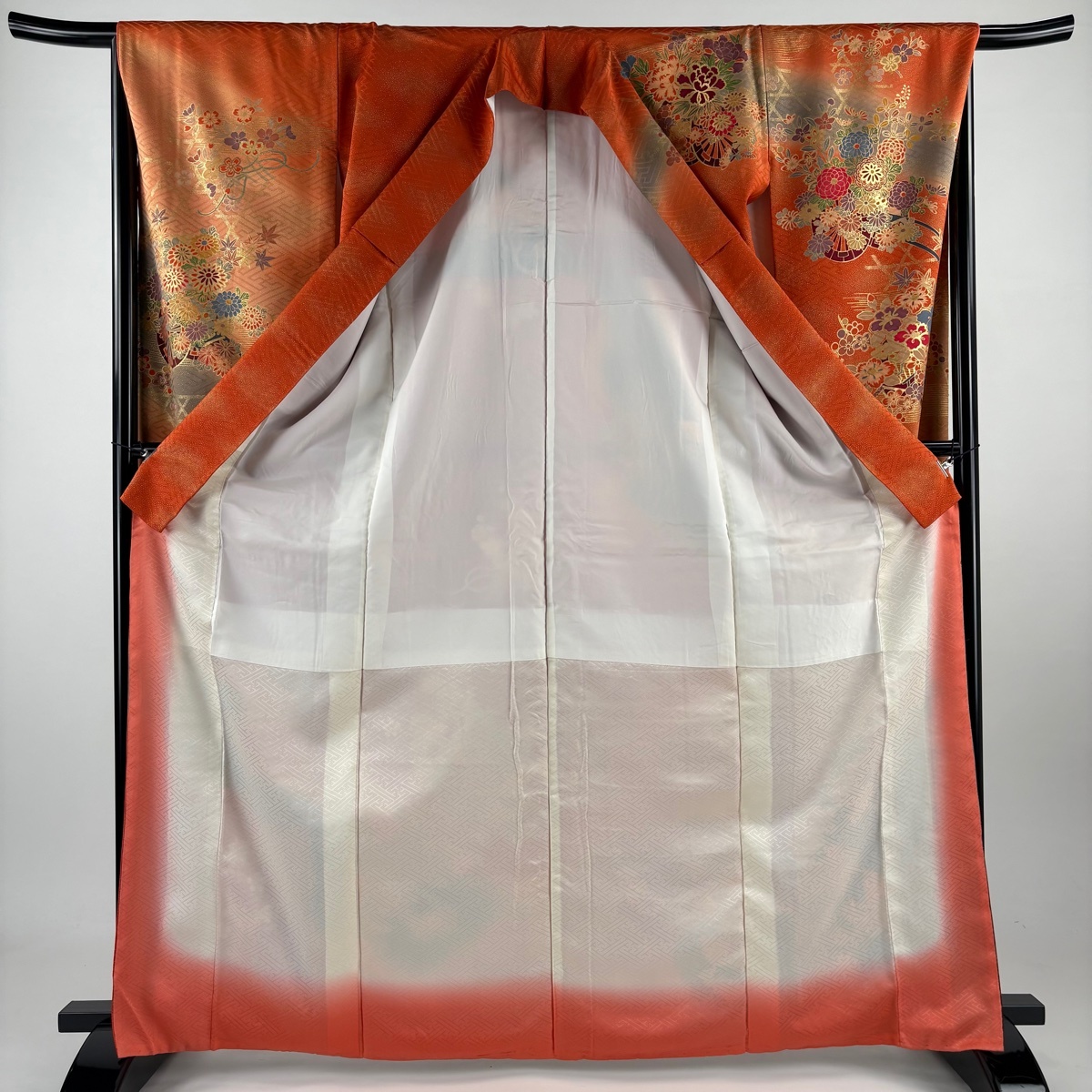 振袖 名品 花車 籠目 金糸 金彩 オレンジ 袷 身丈165.5 裄丈66 M 正絹 【中古】 |