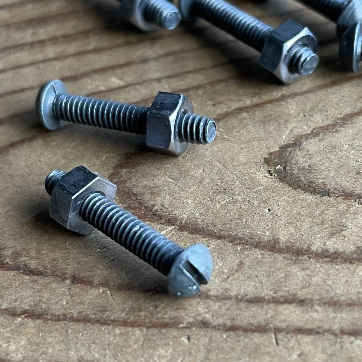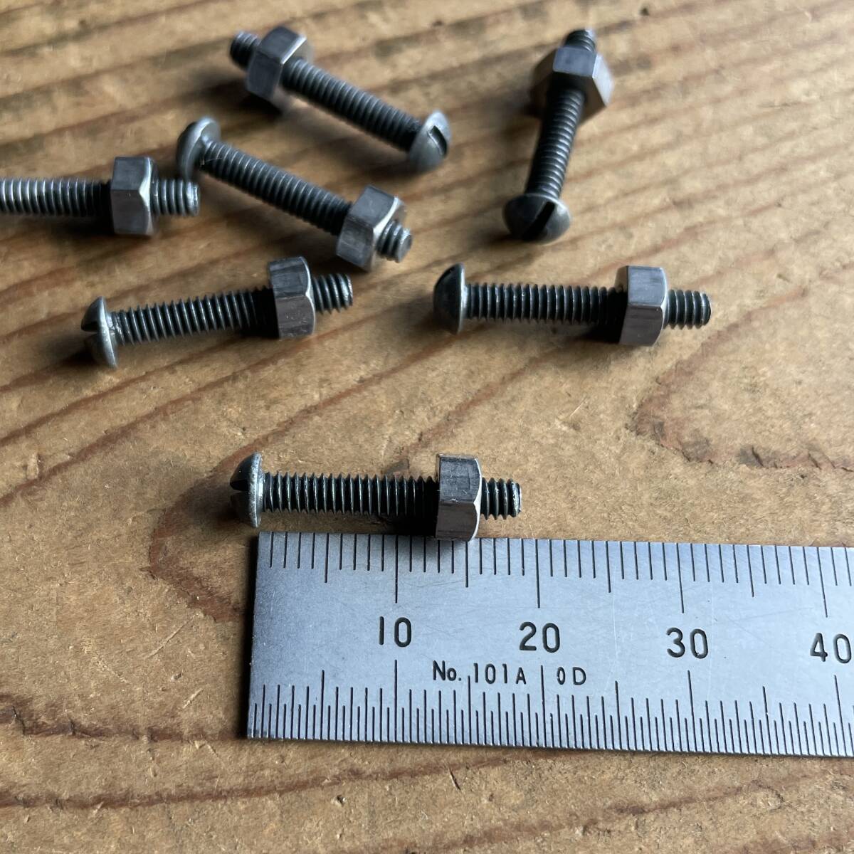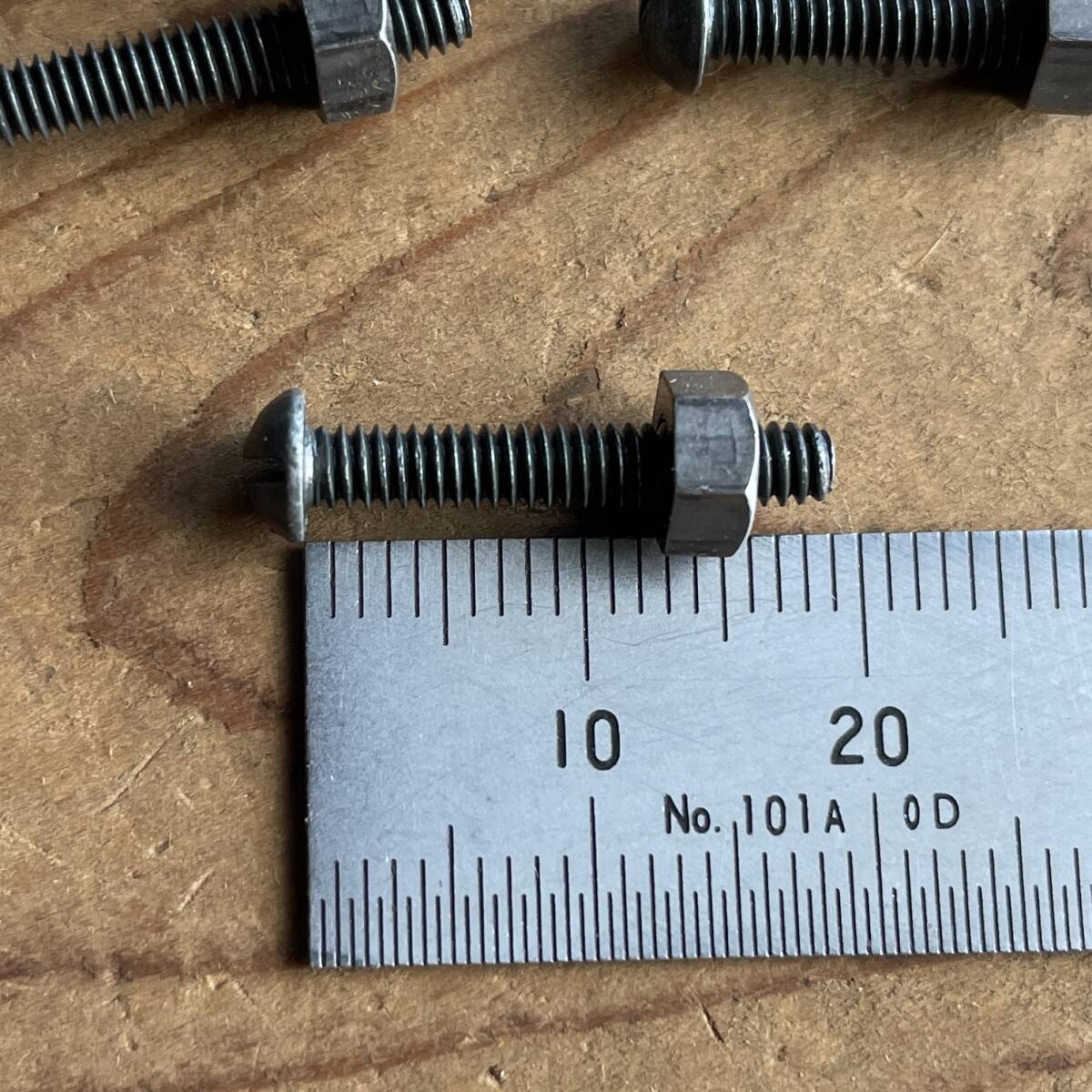 ・鉄の W 1/8(1分)×20ミリの丸頭マイナスボルトネジとナットです。