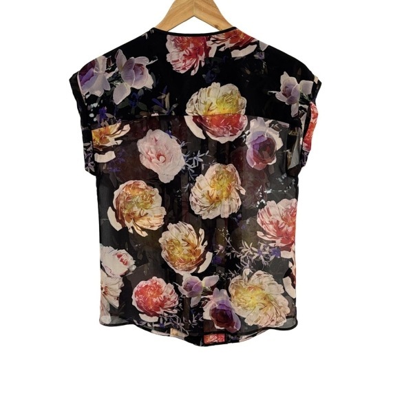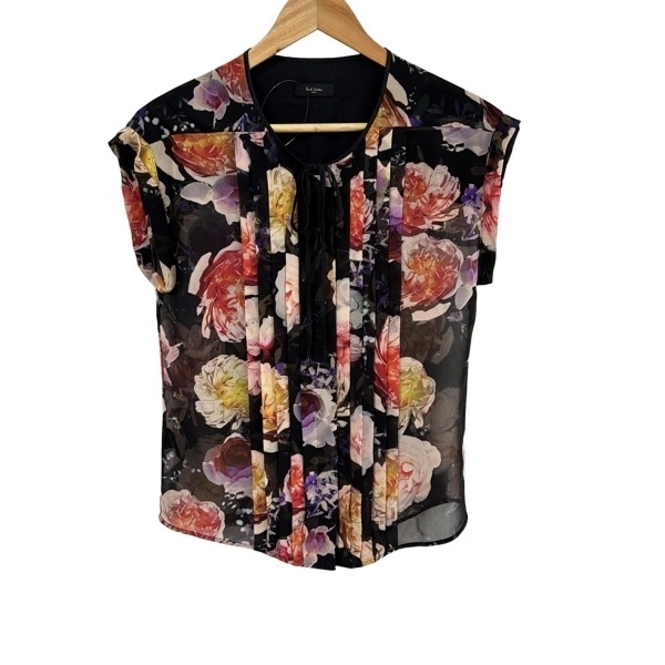 ポールスミスブラック PaulSmith BLACK 半袖シャツブラウス サイズ38 M - 黒×レッド×マルチ レディース 花柄/プリーツ/シースルー 美品