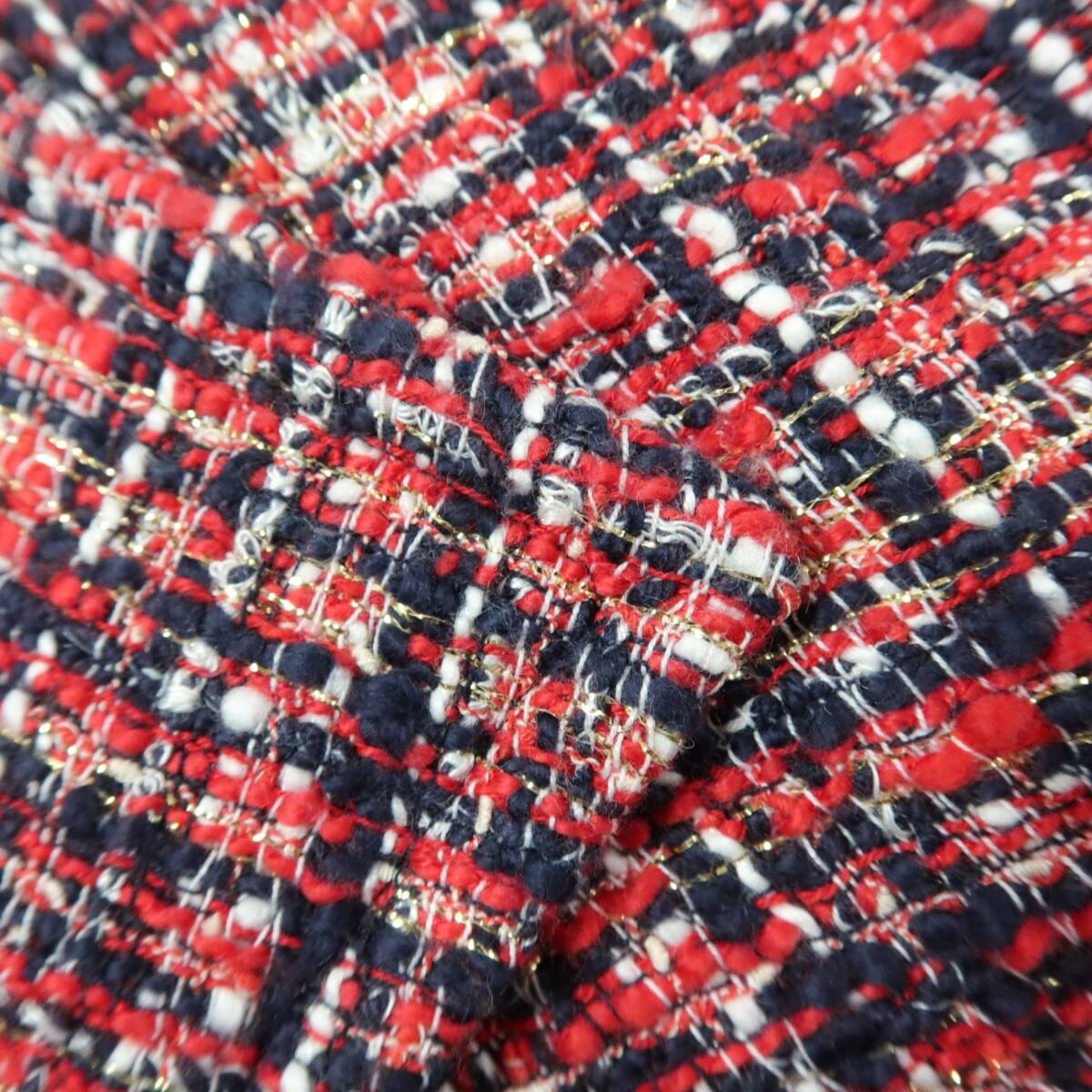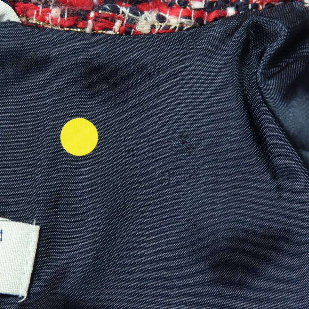 商品説明 | 【実寸約】肩幅44袖丈57バスト116着丈64(cm) 【サイズ表記】21 【素材】コットン83%レーヨン10%ウール3%ナイロン3%ポリエステル1% 【状態】普通の使用感のあるお品物 ブランドタグ付近にひっかけがございますが、その他目立ったダメージは見受けられません。 【デザイン】赤×黒×白系 クールな印象のテーラードジャケットです。 ラメが入ったおしゃれなデザイン♪ 厚手/織り 裏地あり/ポケットあり |