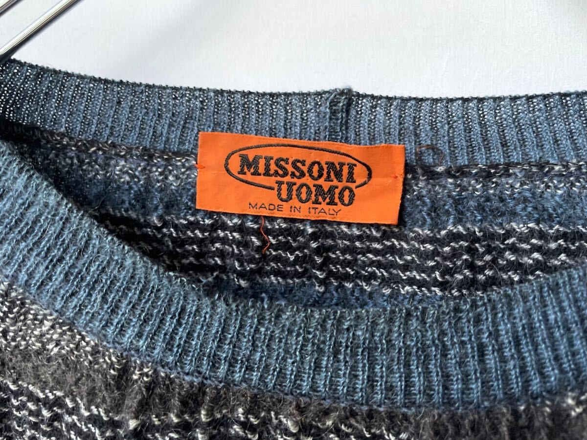 A men's knitwear piece for fall/winter, featuring a subtle multicolor palette with a mix of cool tones.