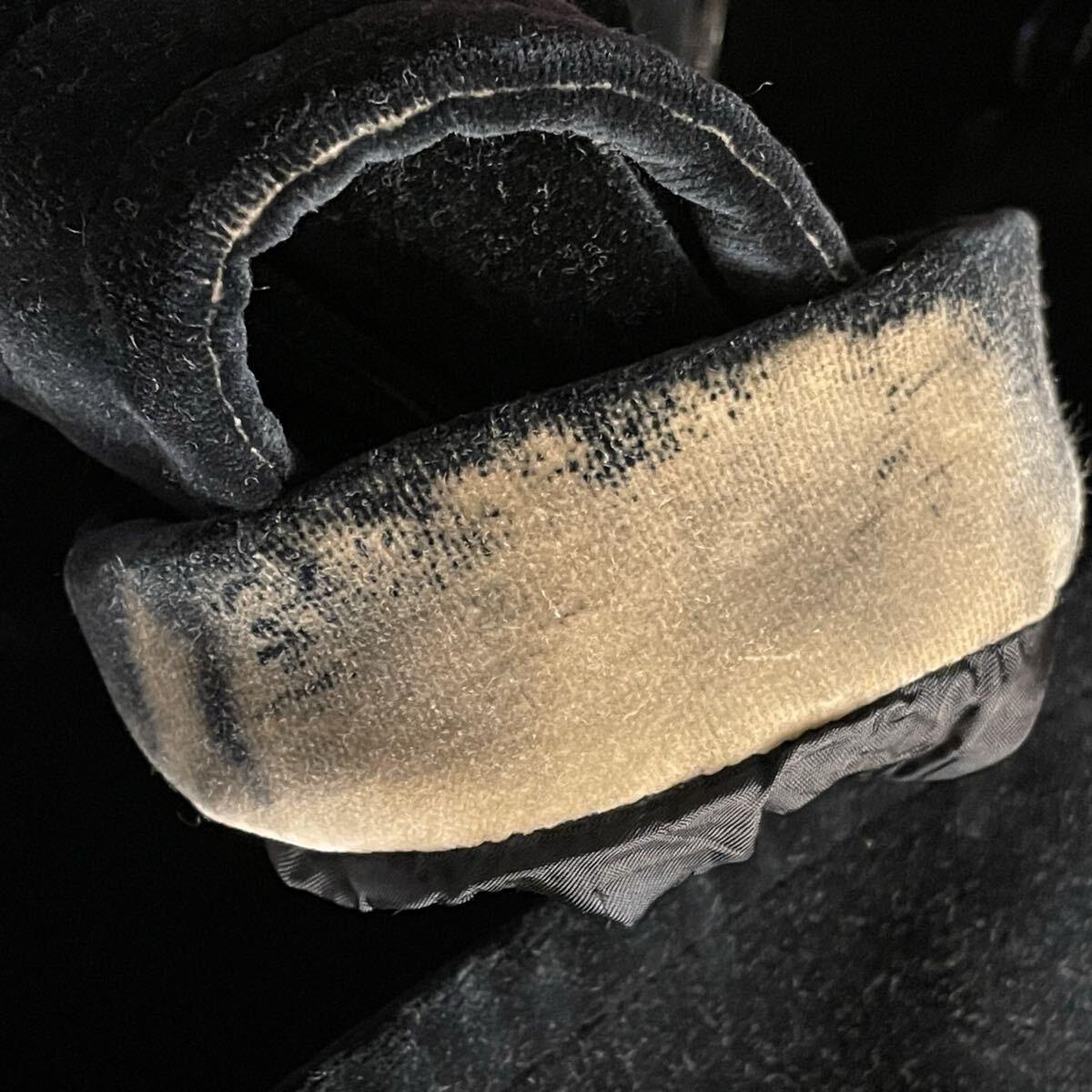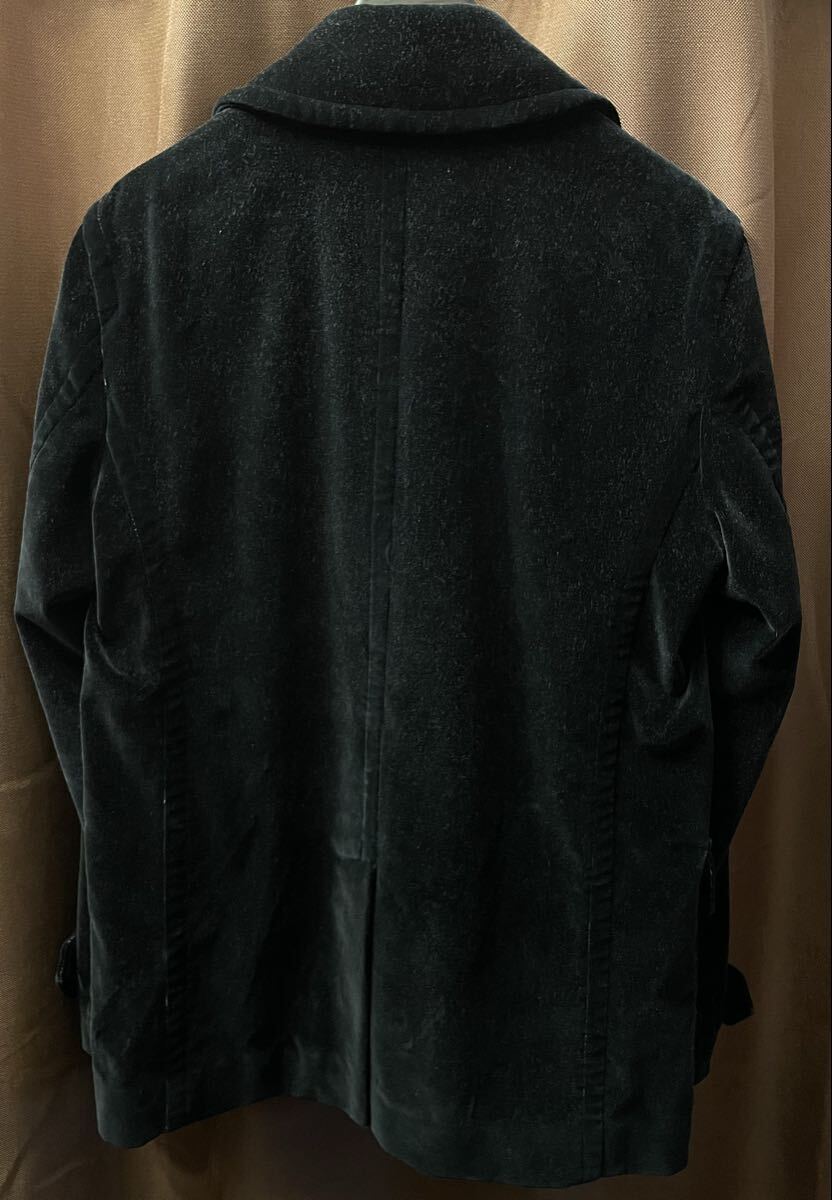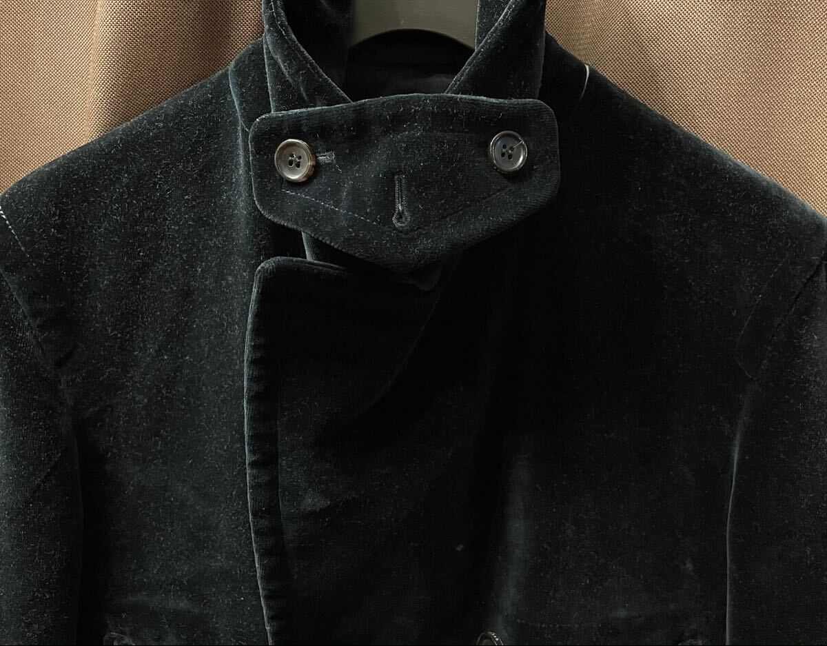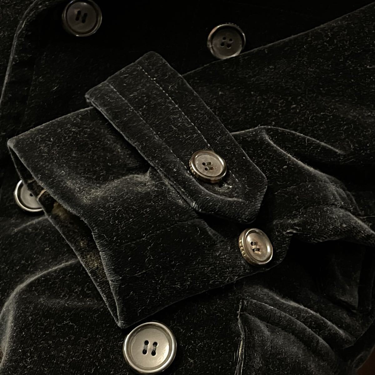 高級感のあるベルベット生地を使っており、ブラックの生地ではなく、ベージュの生地をブラックに染めているので、袖口やポケット部分にベージュが一部見られ、生地を重ねて縫い合わせている部分などが配色のように見えるデザインとなっております。